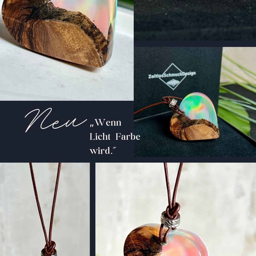 Schimmernd wie das Polarlicht, geheimnisvoll wie ein Tropfen Morgentau – Schmuckstücke der Kollektion Opalglanz verbinden die faszinierende Leuchtkraft von synthetischem Opal mit natürlichen Materialien wie Maserholz, Harz und Silber.