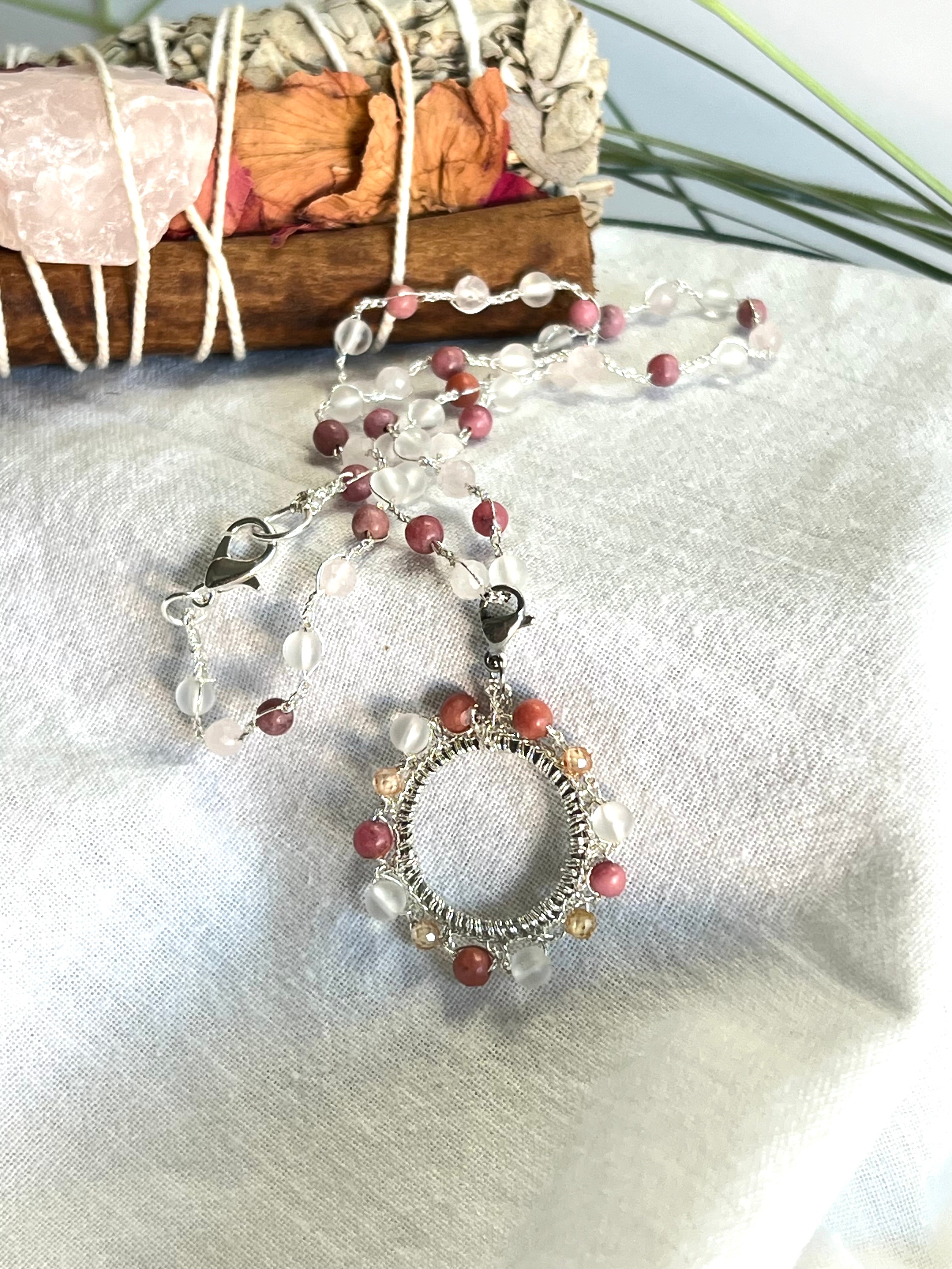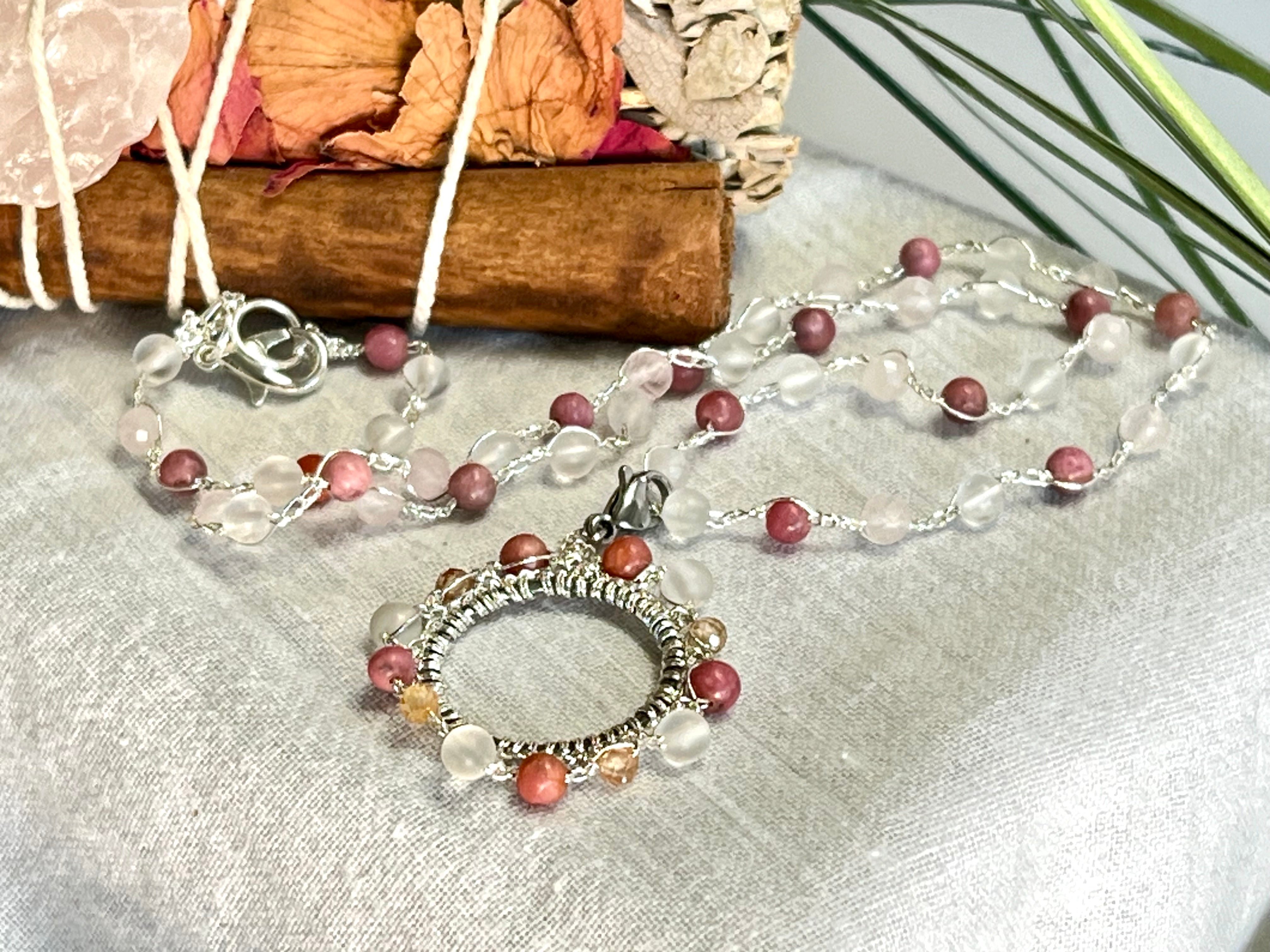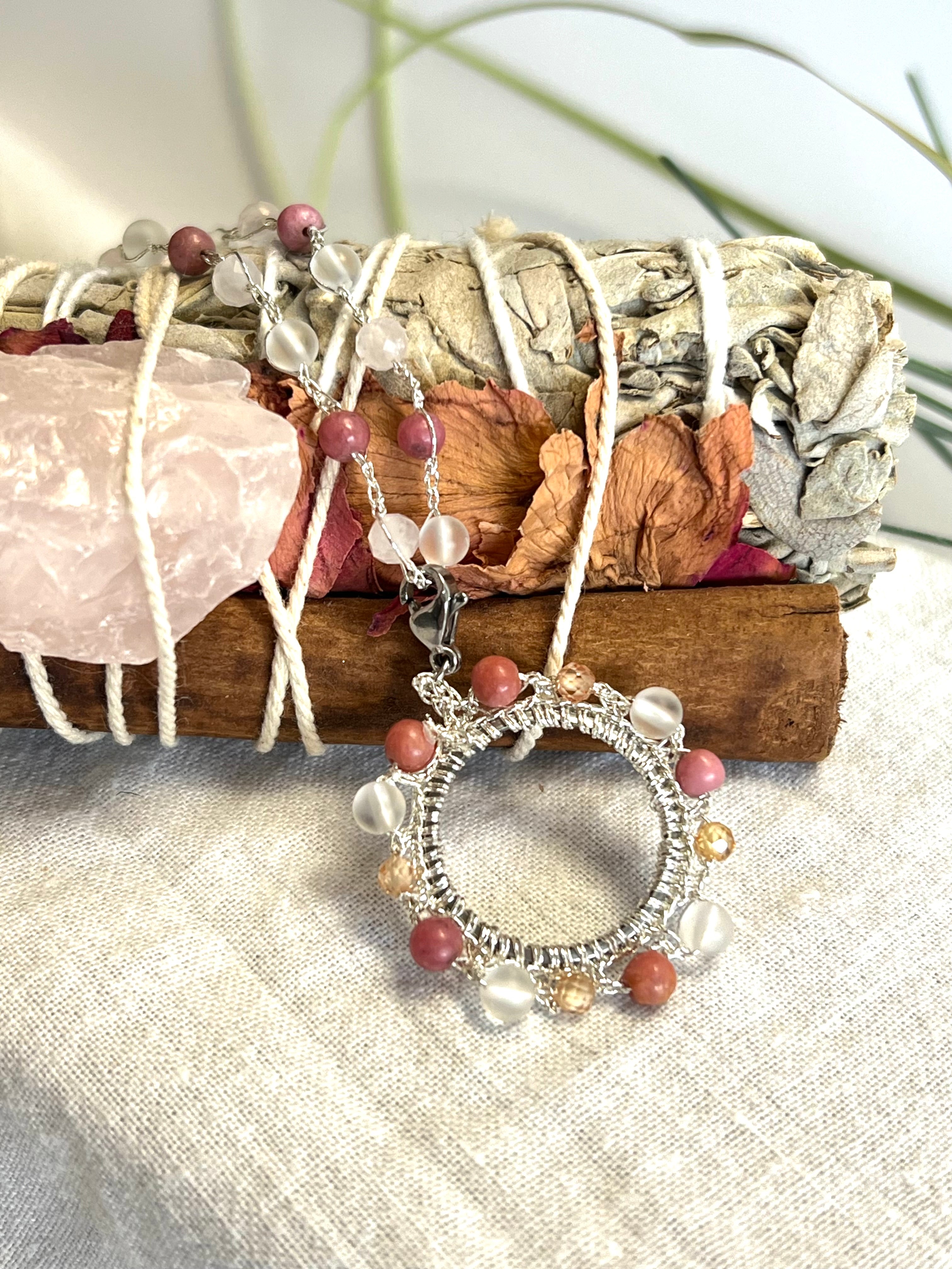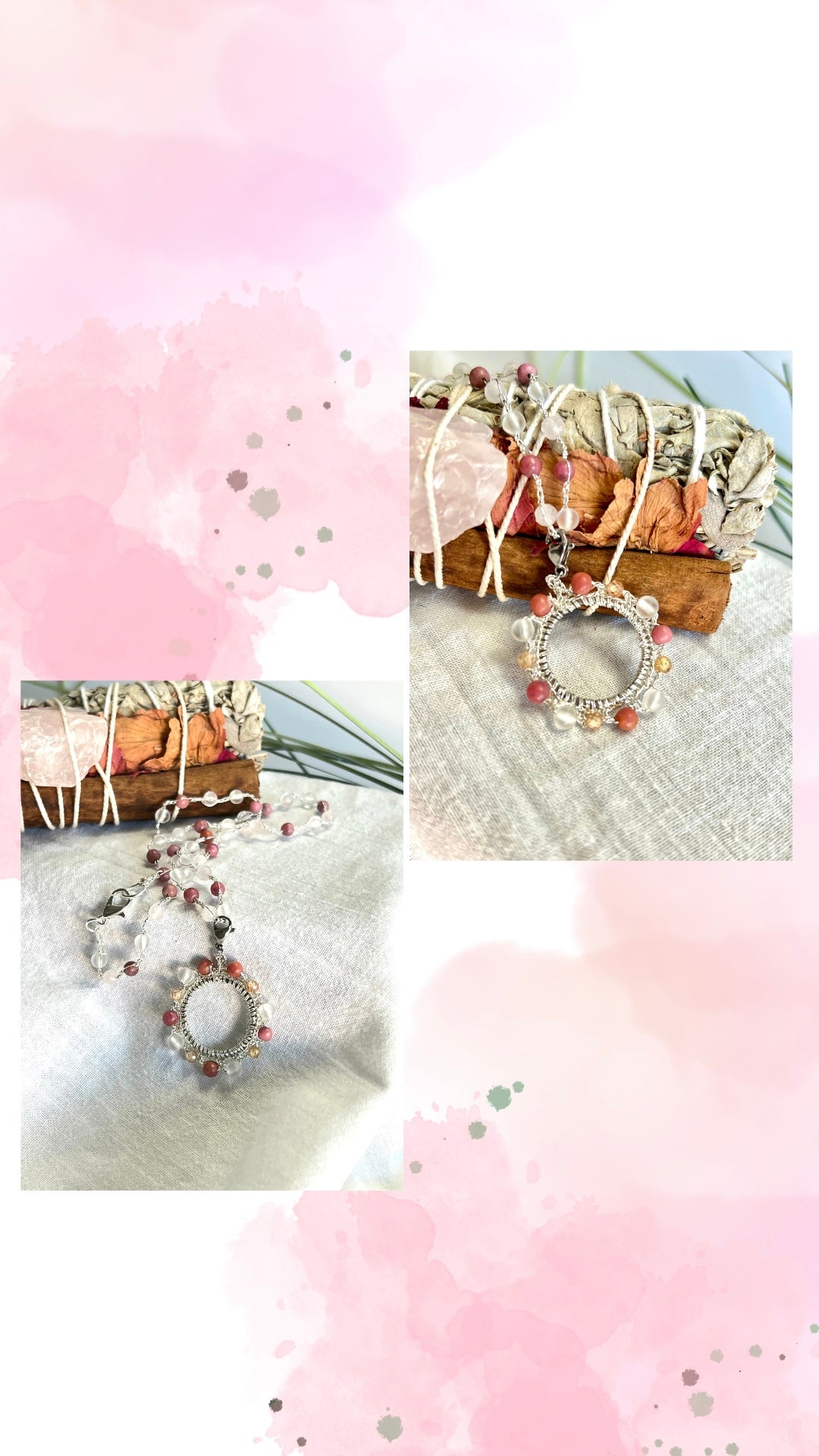 Edelsteinperlen Halskette und runder Anhänger aus einem silbernen Garn gehäkelt,filigran,facettiert Rosenquarz, Bergkristall, Rhodonit