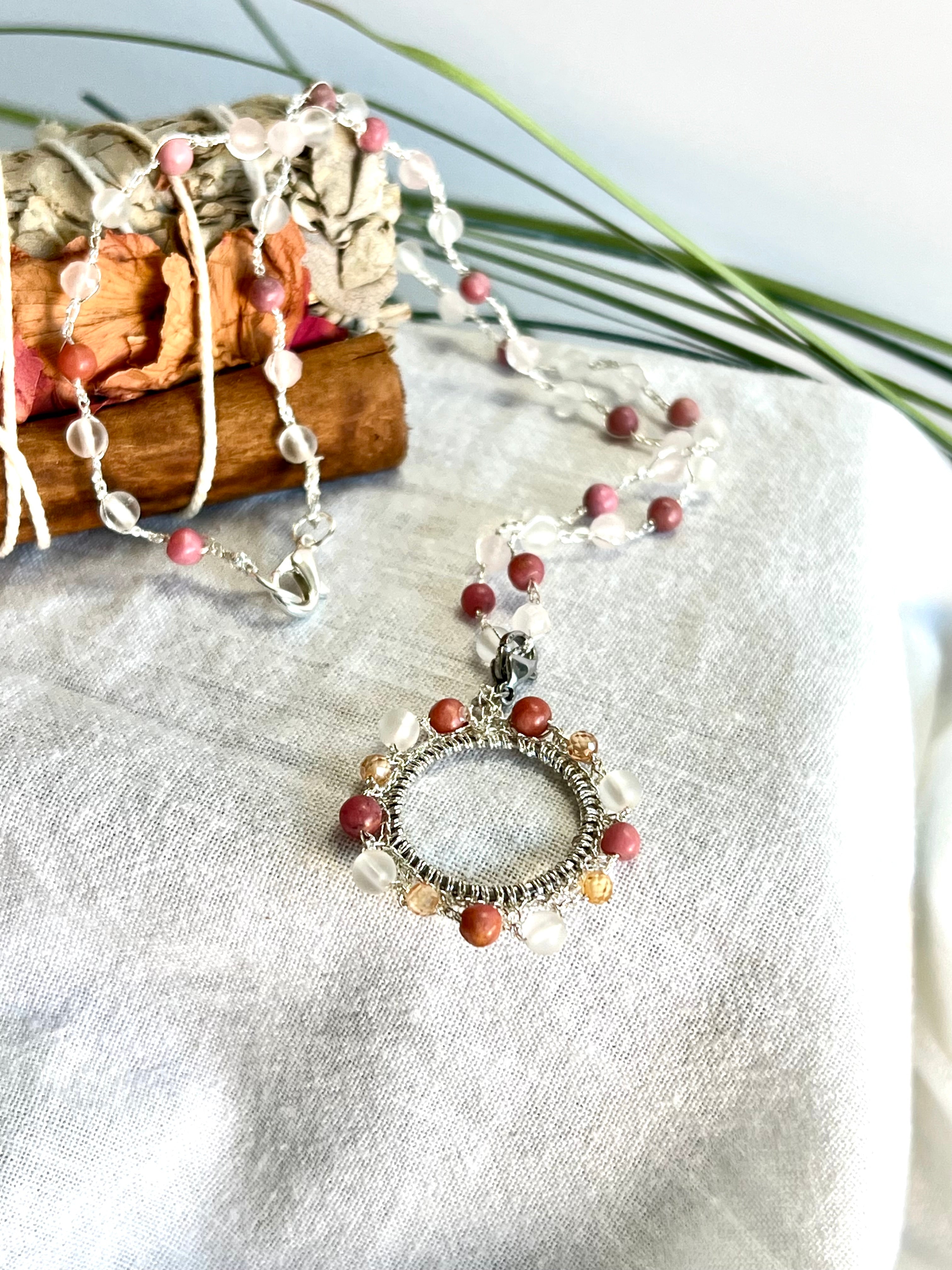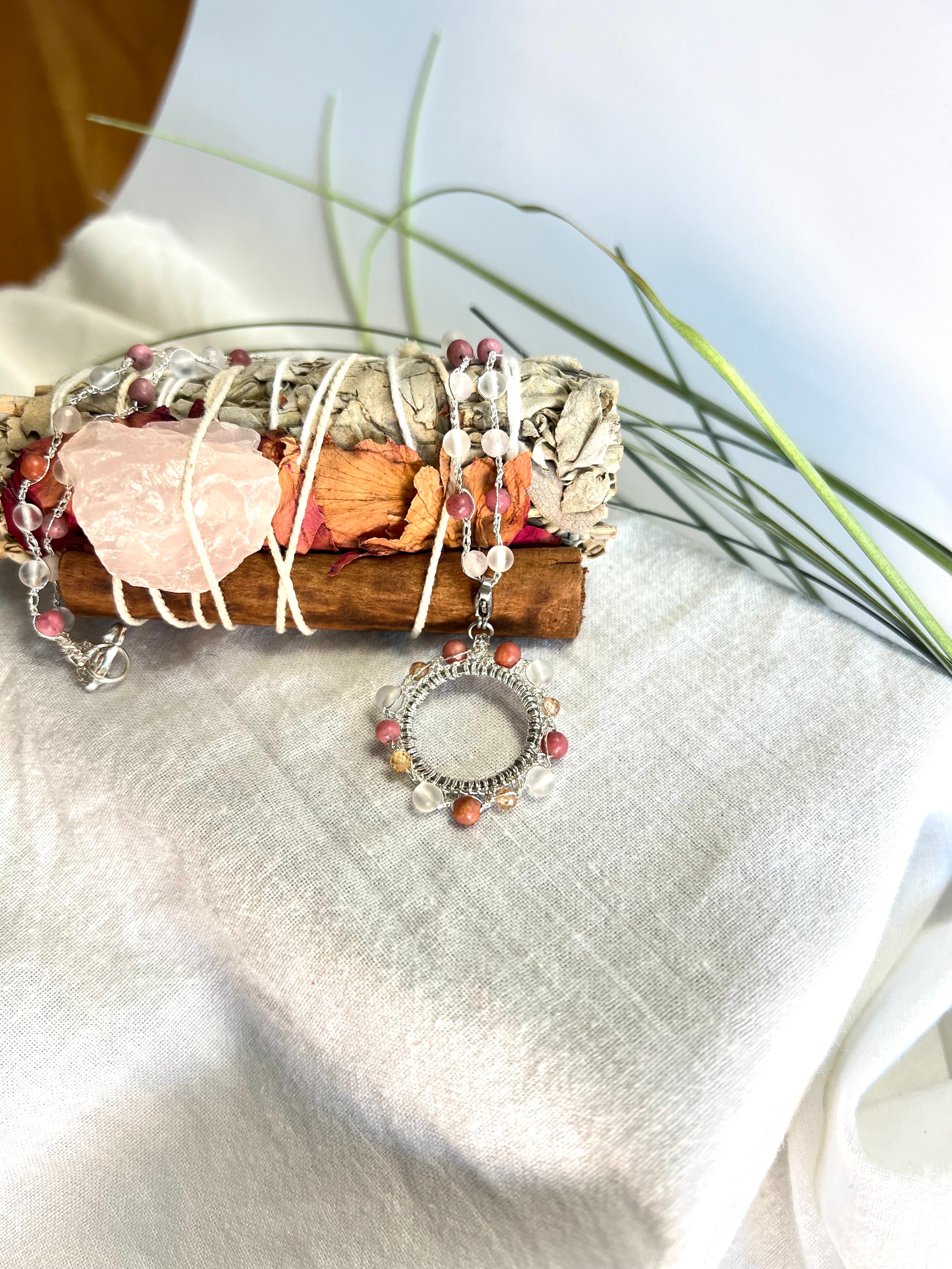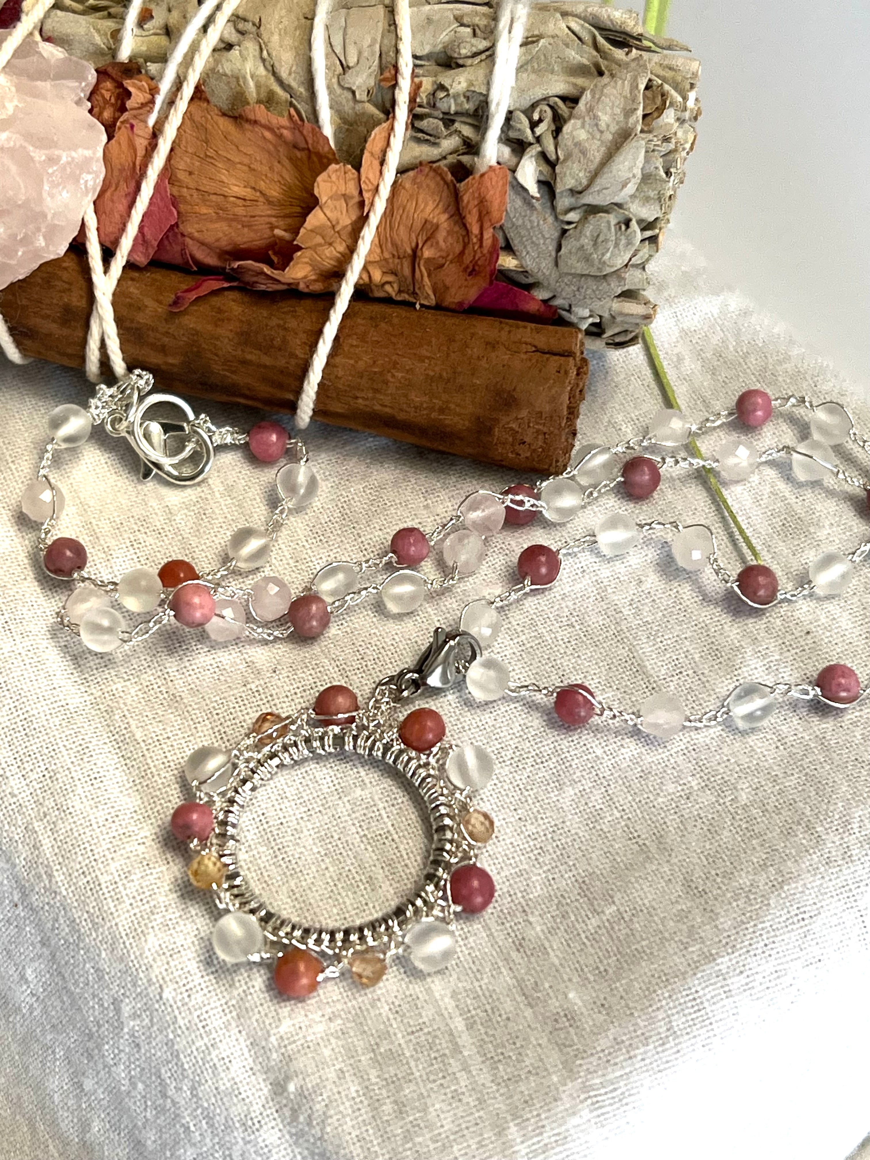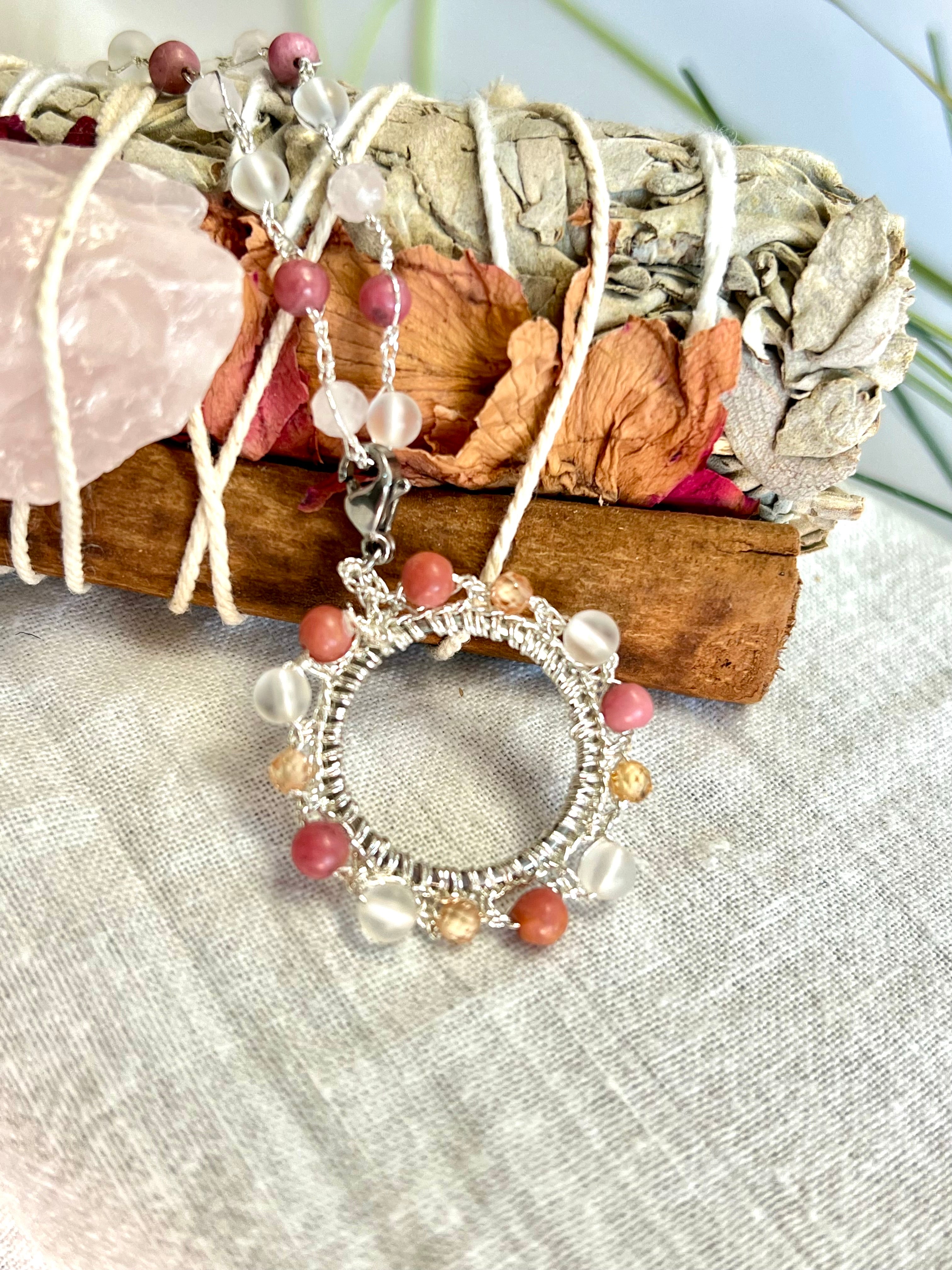 Edelsteinperlen Halskette und runder Anhänger aus einem silbernen Garn gehäkelt,filigran,facettiert Rosenquarz, Bergkristall, Rhodonit