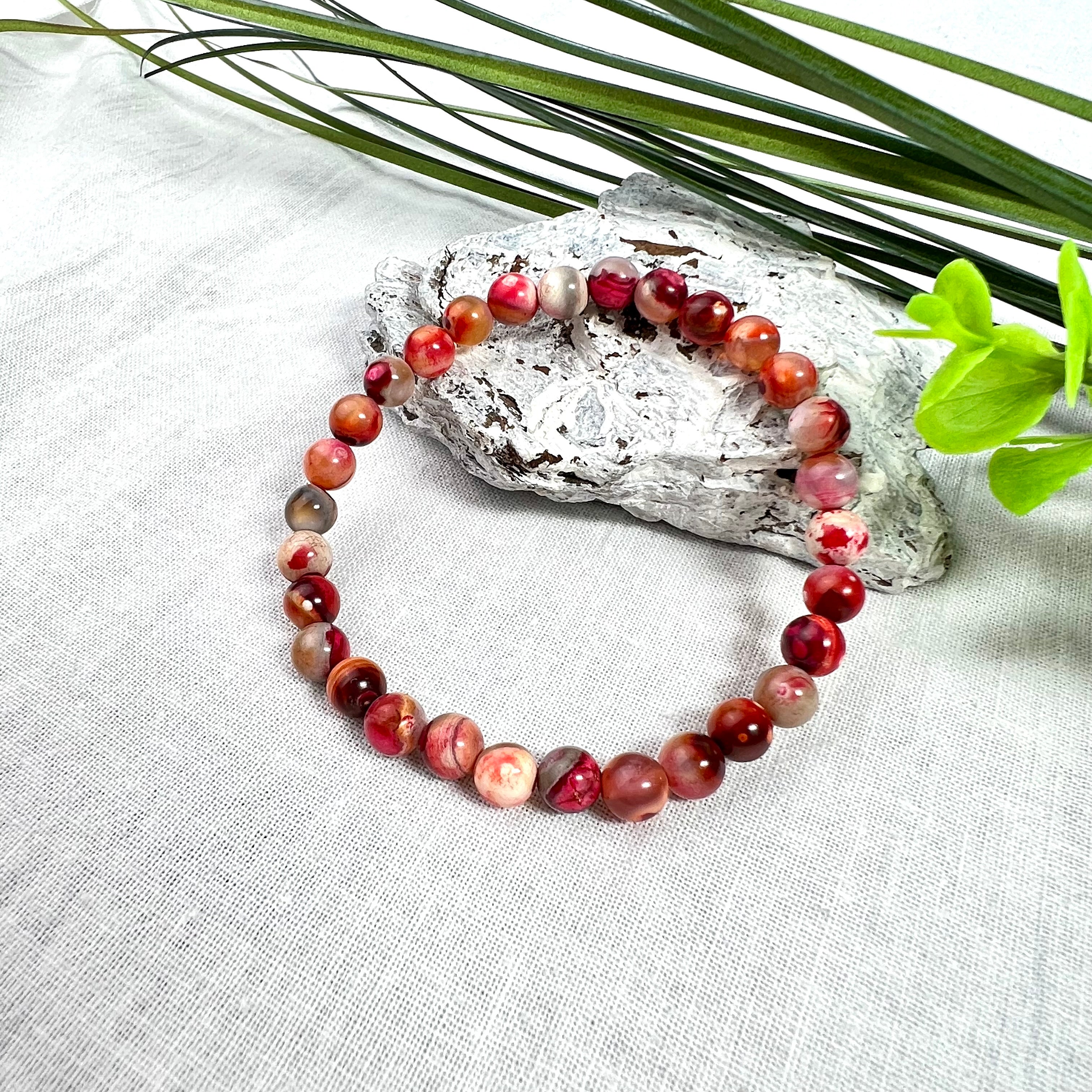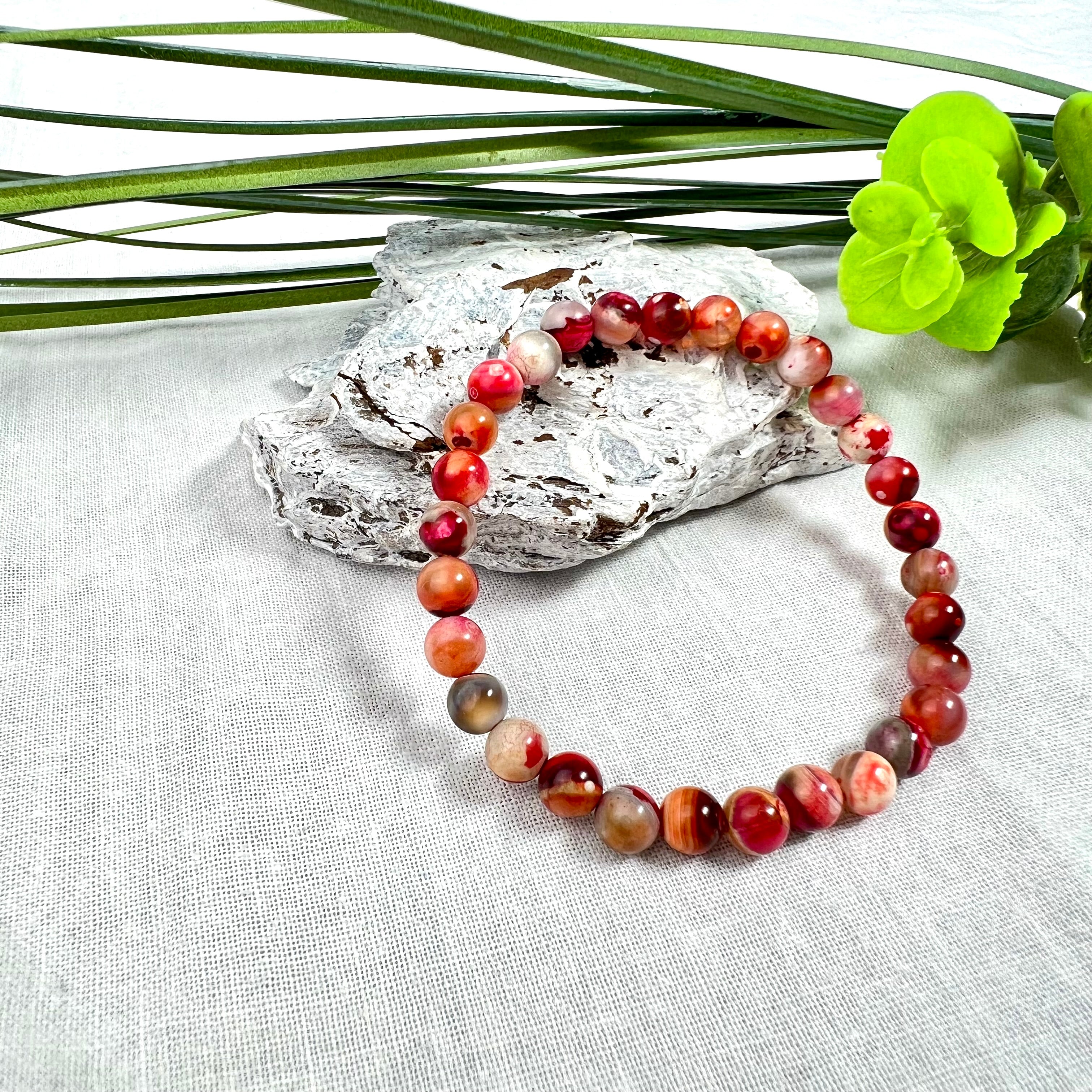 Verleihen Sie Ihrem Look einen Hauch von Eleganz mit unserem Rot-Pink Achat Armband. Diese atemberaubende Schmuckstücke kombiniert hochwertige, natürliche Edelsteine mit einem dehnbaren Gummiband für optimalen Tragekomfort. Jede Perle ist einzigartig und verleiht dem Armband einen individuellen Charme.