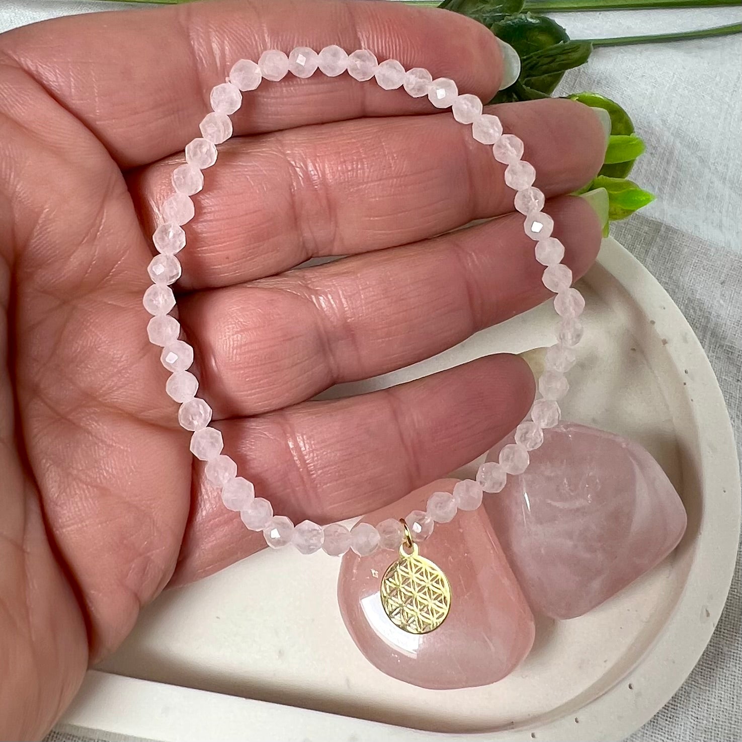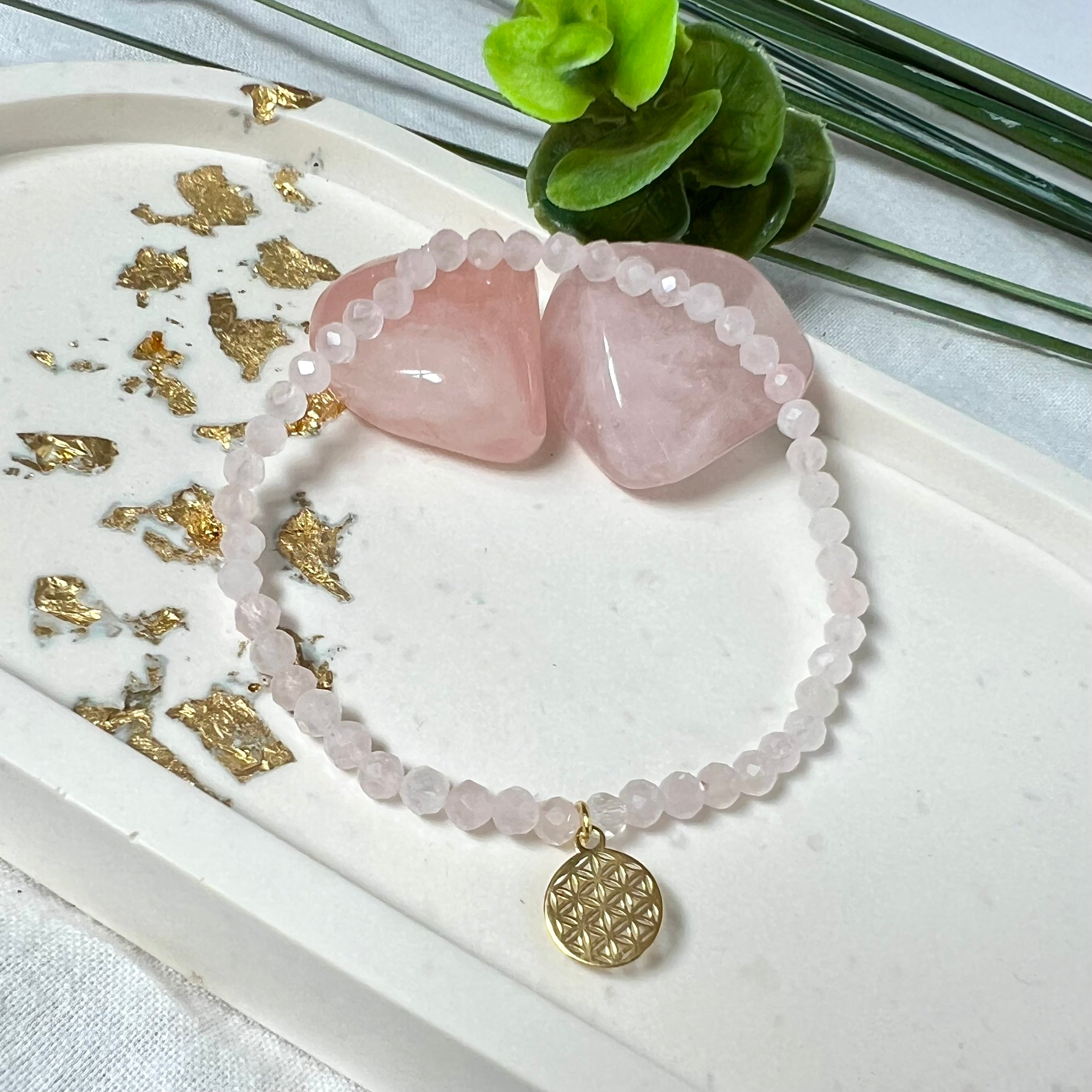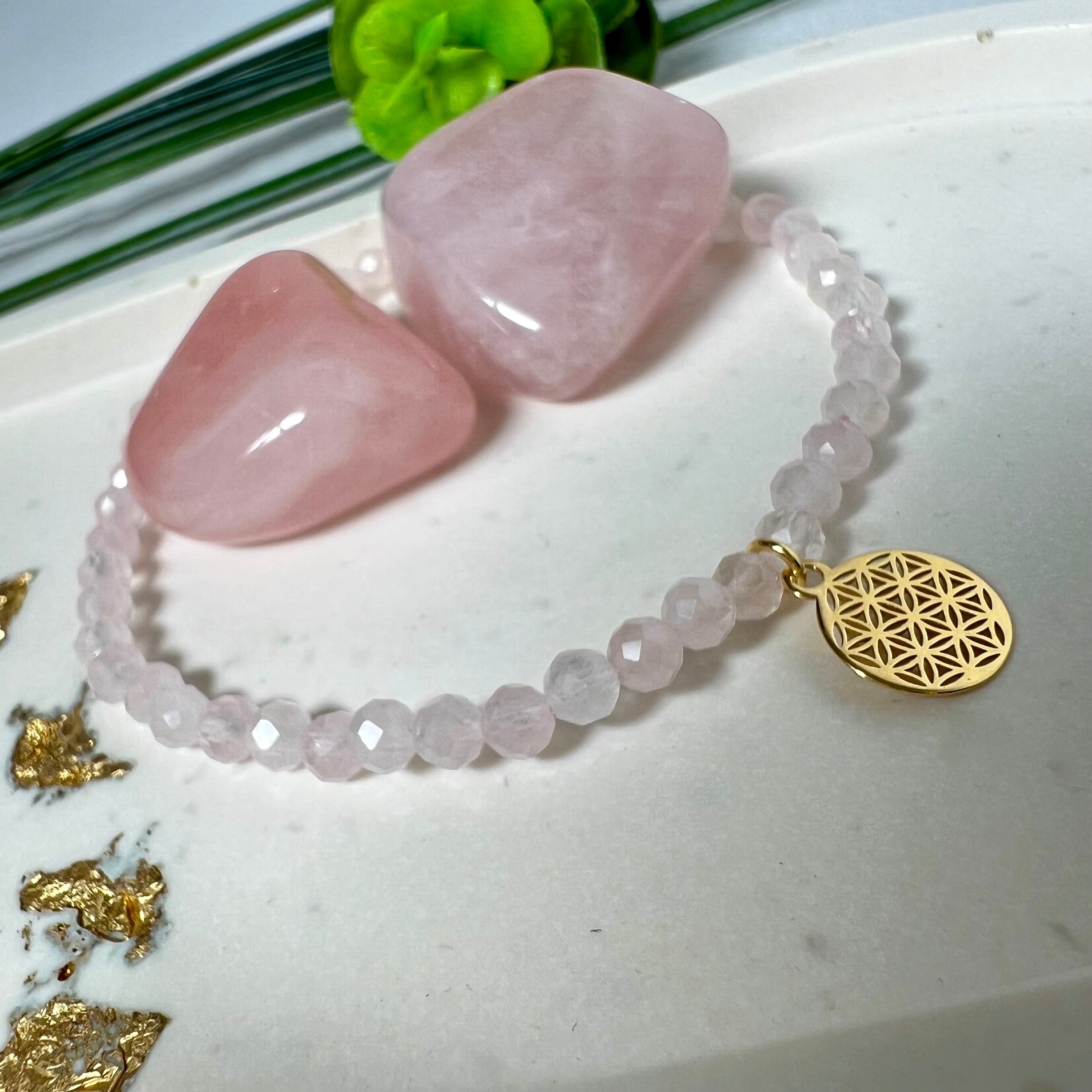 Herzlicht – Rosenquarz-Armband mit vergoldetem Blume des Lebens Charm