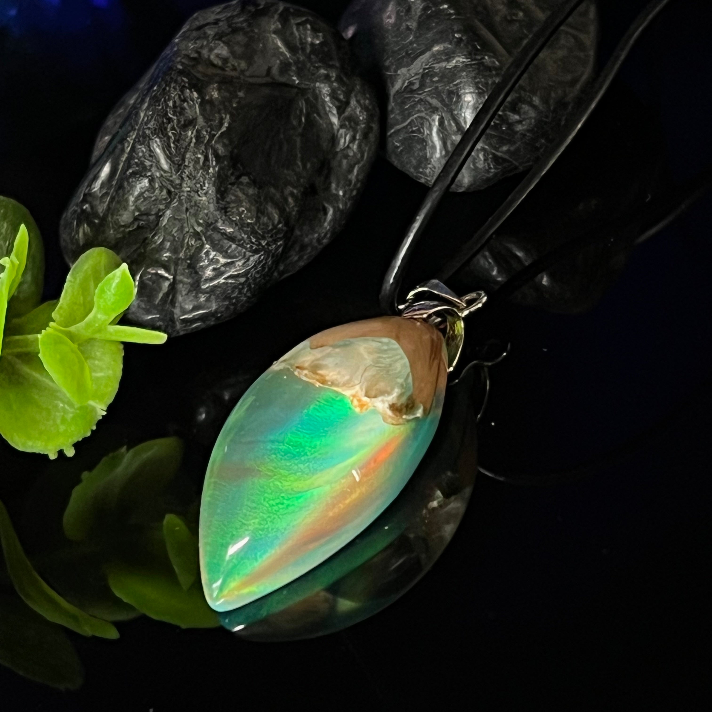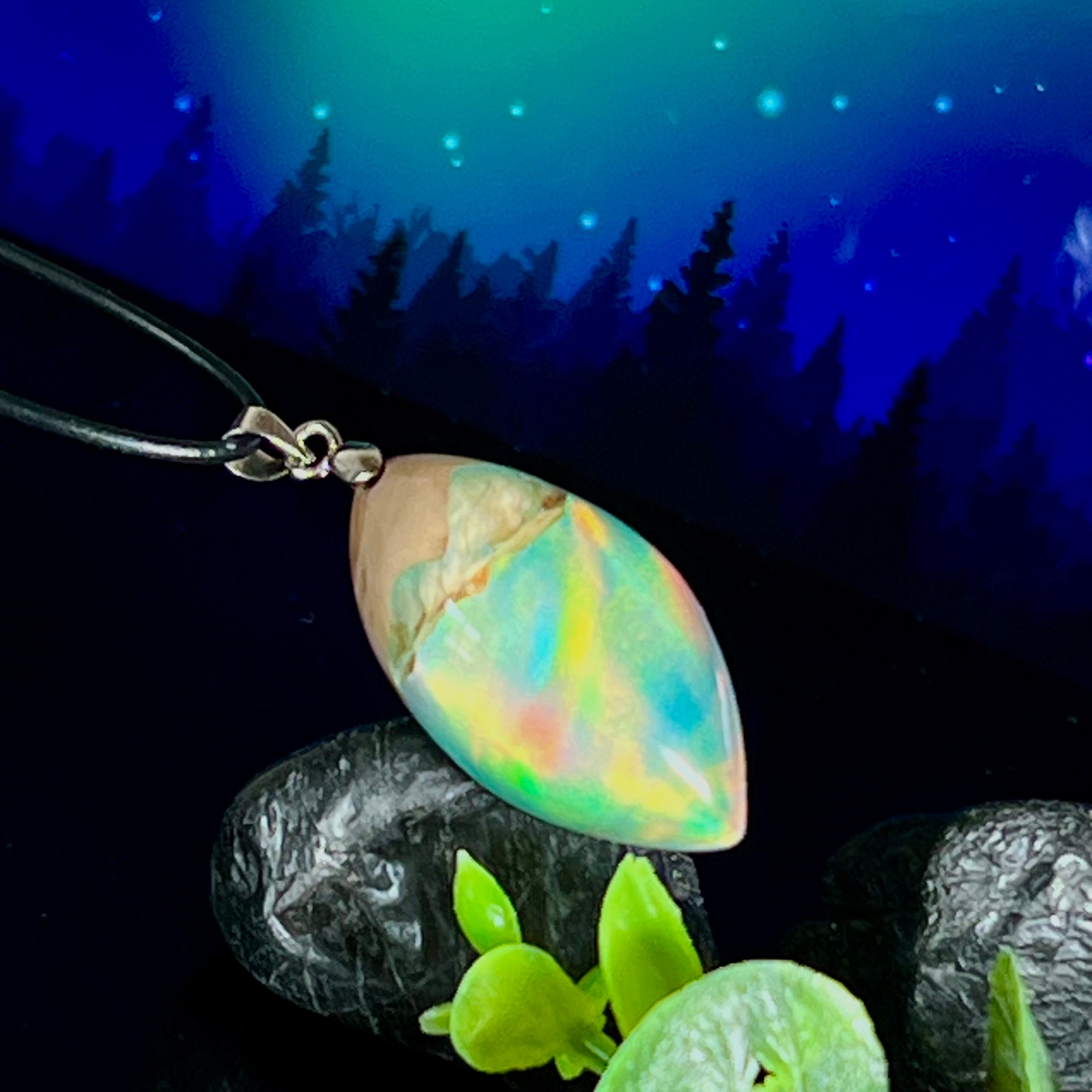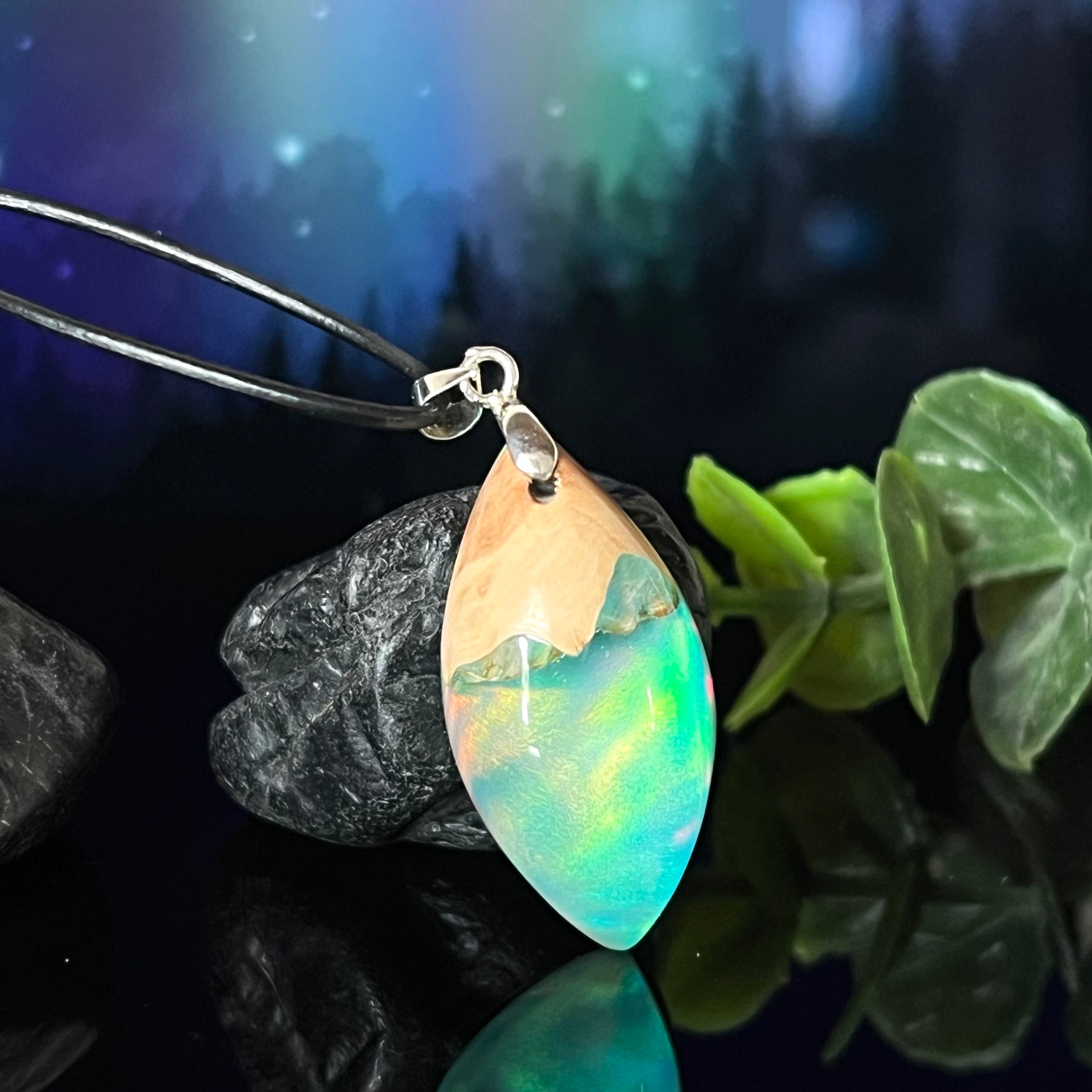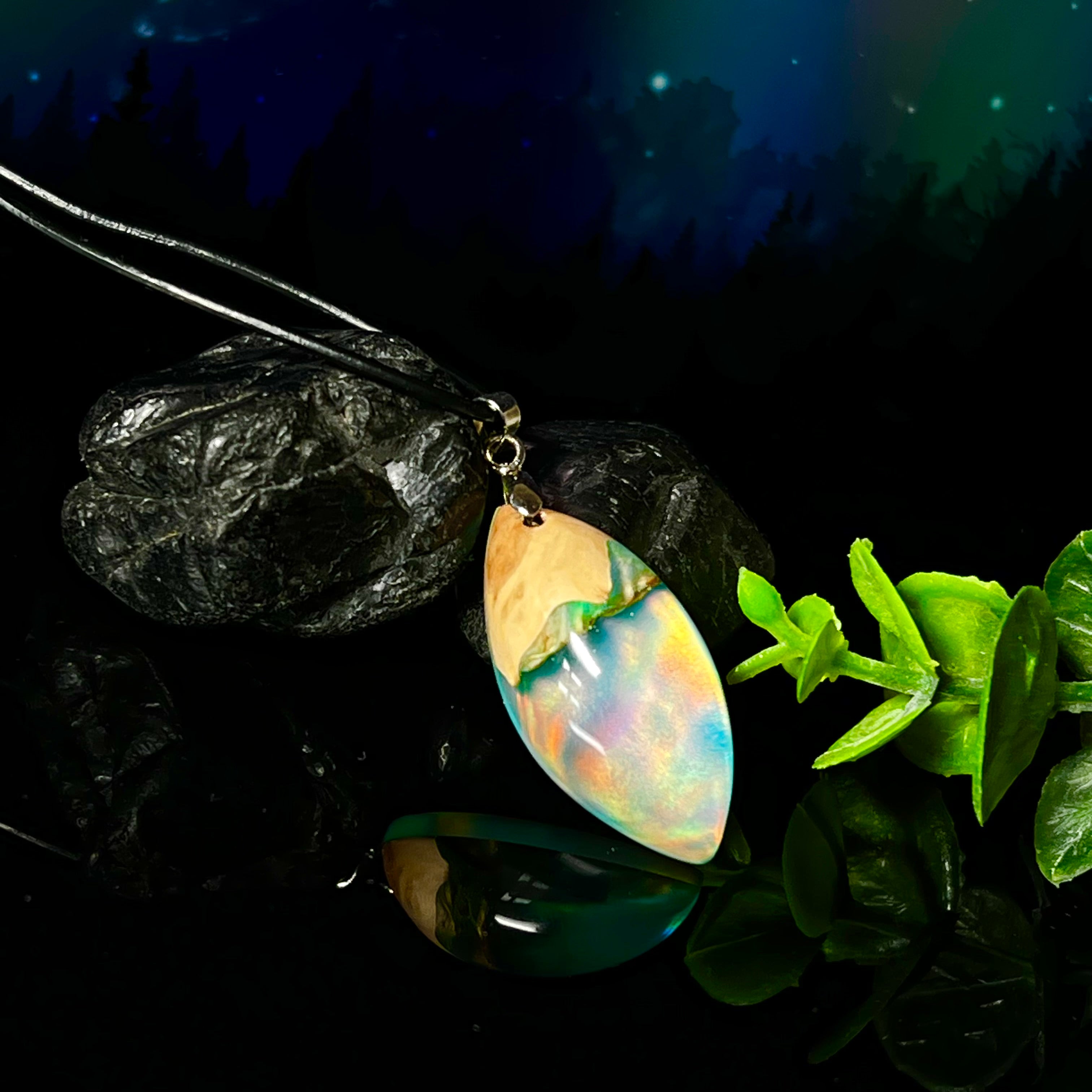 Diese besondere Kette bringt das faszinierende Leuchten der Nordlichter direkt zu Ihnen. Der handgefertigte Anhänger aus charaktervollem Maserholz und Harz mit Aurora-Effekt durch einen synthetischen Opal ist ein echter Blickfang – jedes Stück ein Unikat, das die Kraft der Natur und die Magie des Lichts vereint.