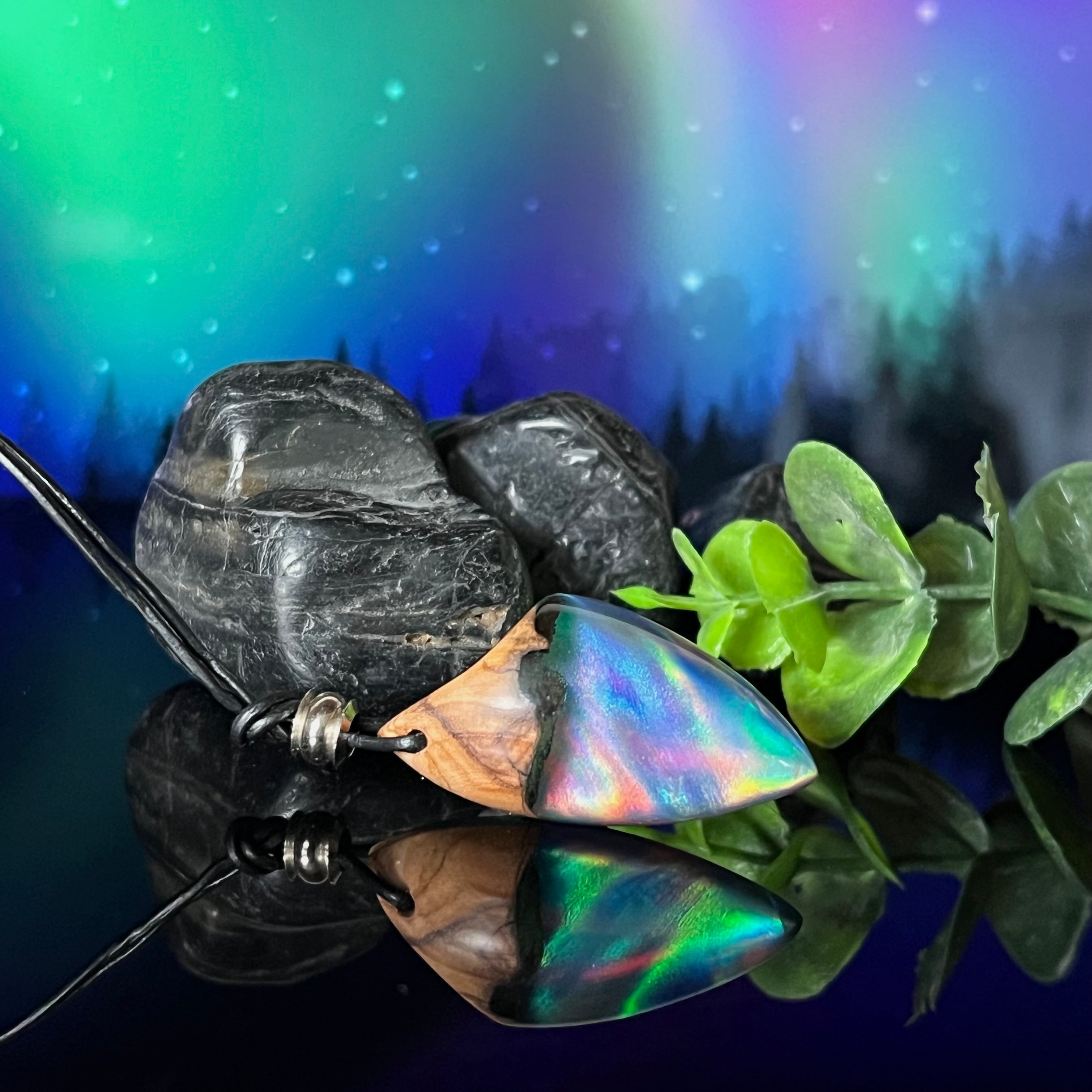 Bringen Sie das Leuchten der Polarlichter direkt zu sich nach Hause! Diese handgefertigte Aurora Borealis Kette vereint die natürliche Wärme von edlem Olivenholz mit dem faszinierenden Farbspiel von schimmerndem Harz und synthetischem Opal. Jedes Stück ist ein Unikat und erinnert an das magische Lichtspiel des Nordhimmels – geheimnisvoll, lebendig und einzigartig.
