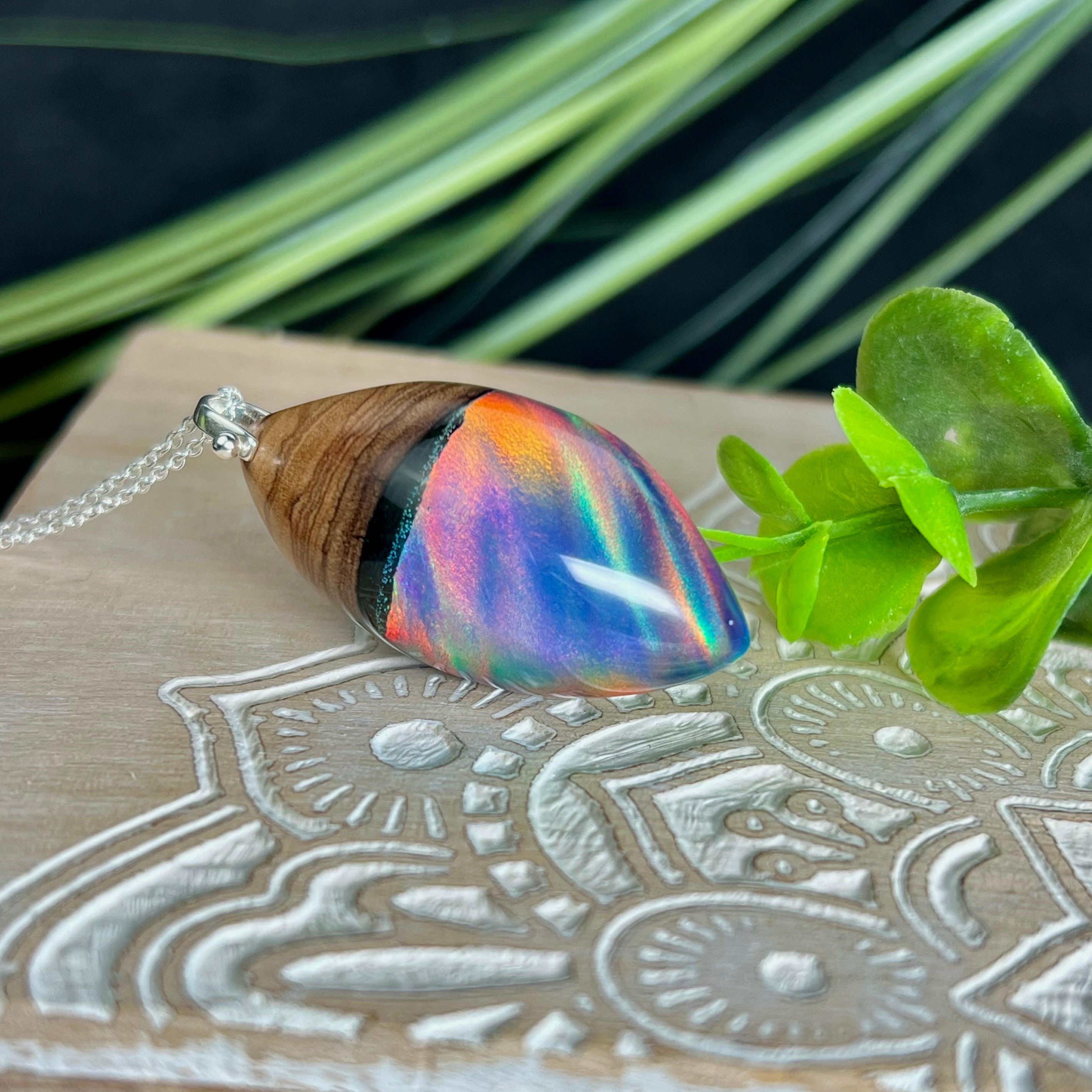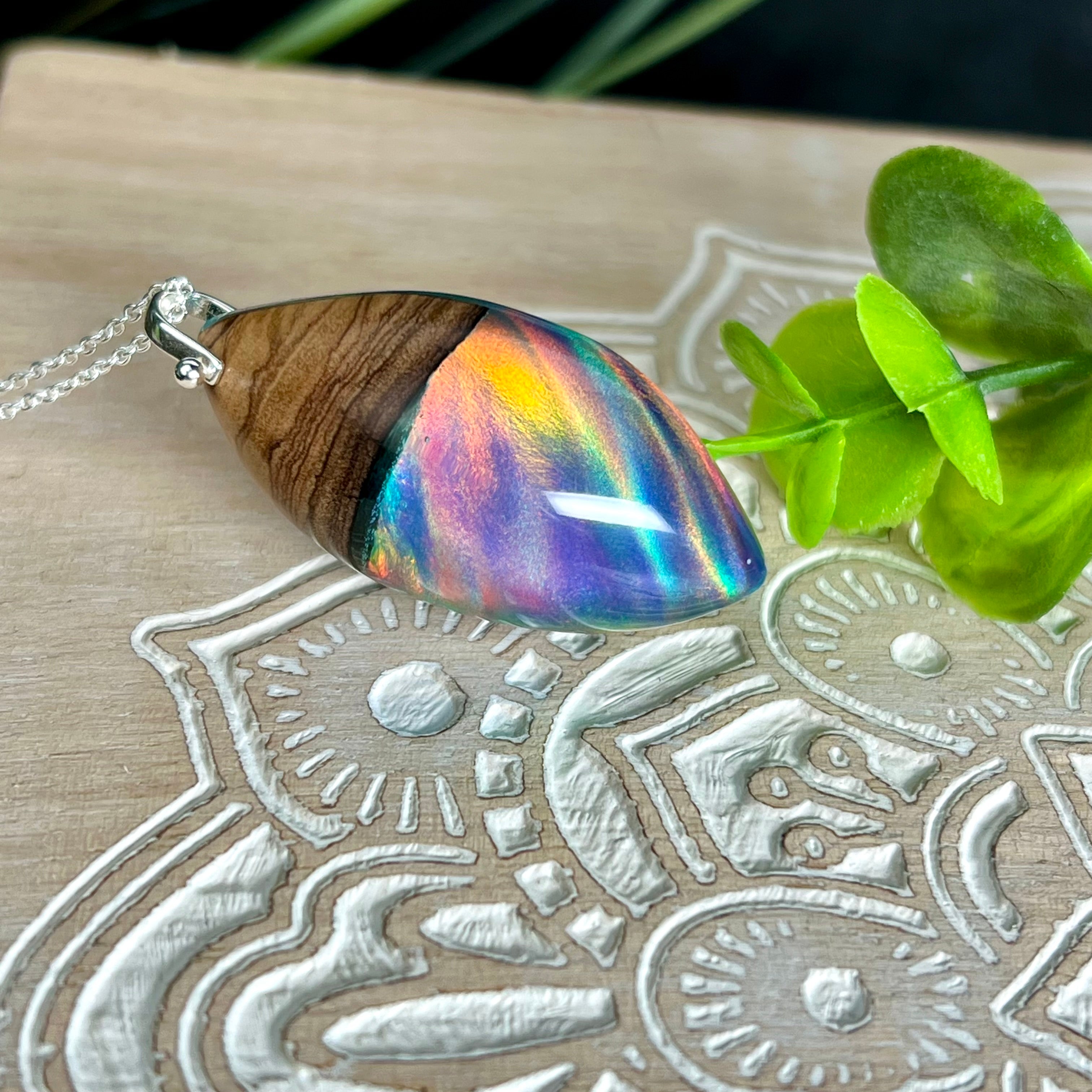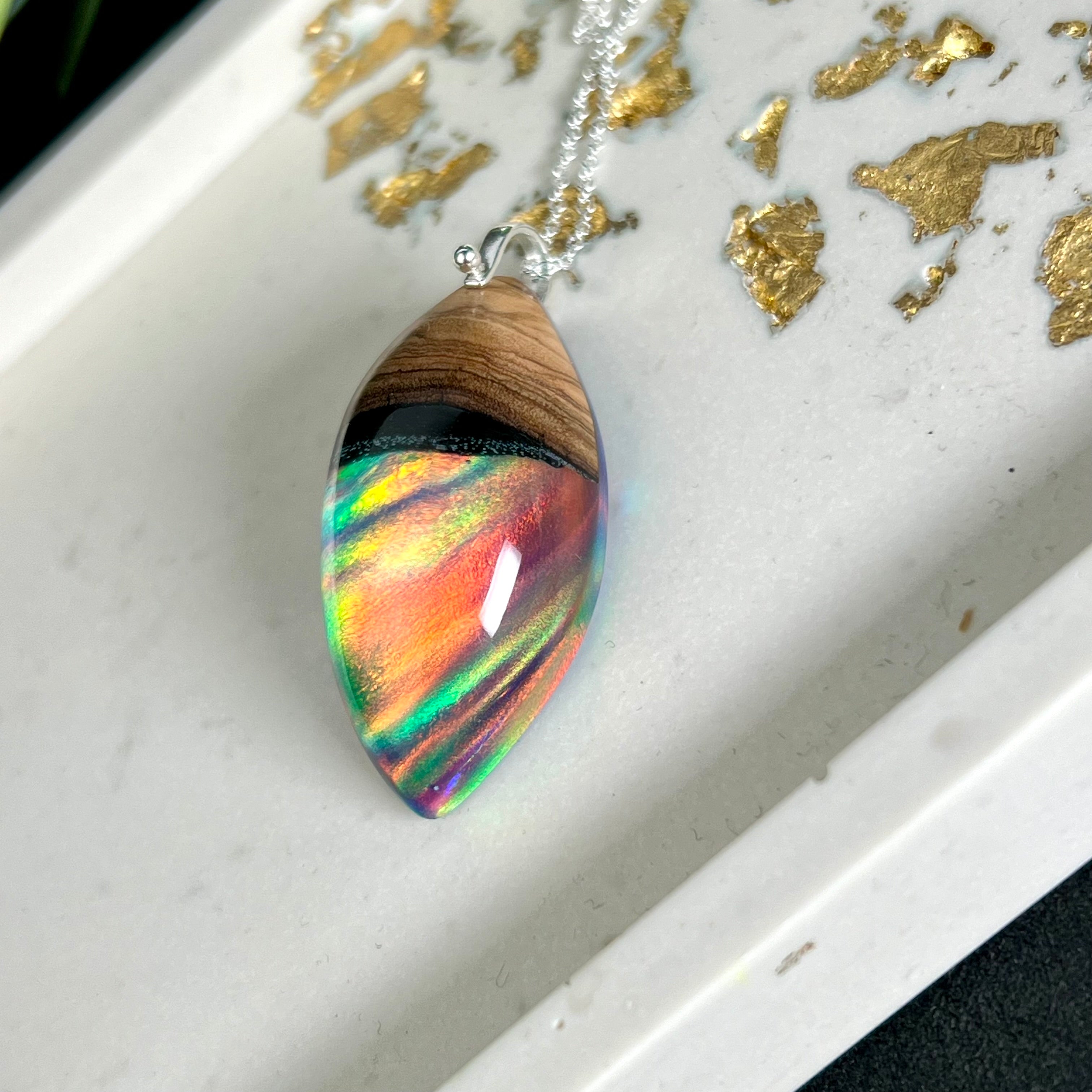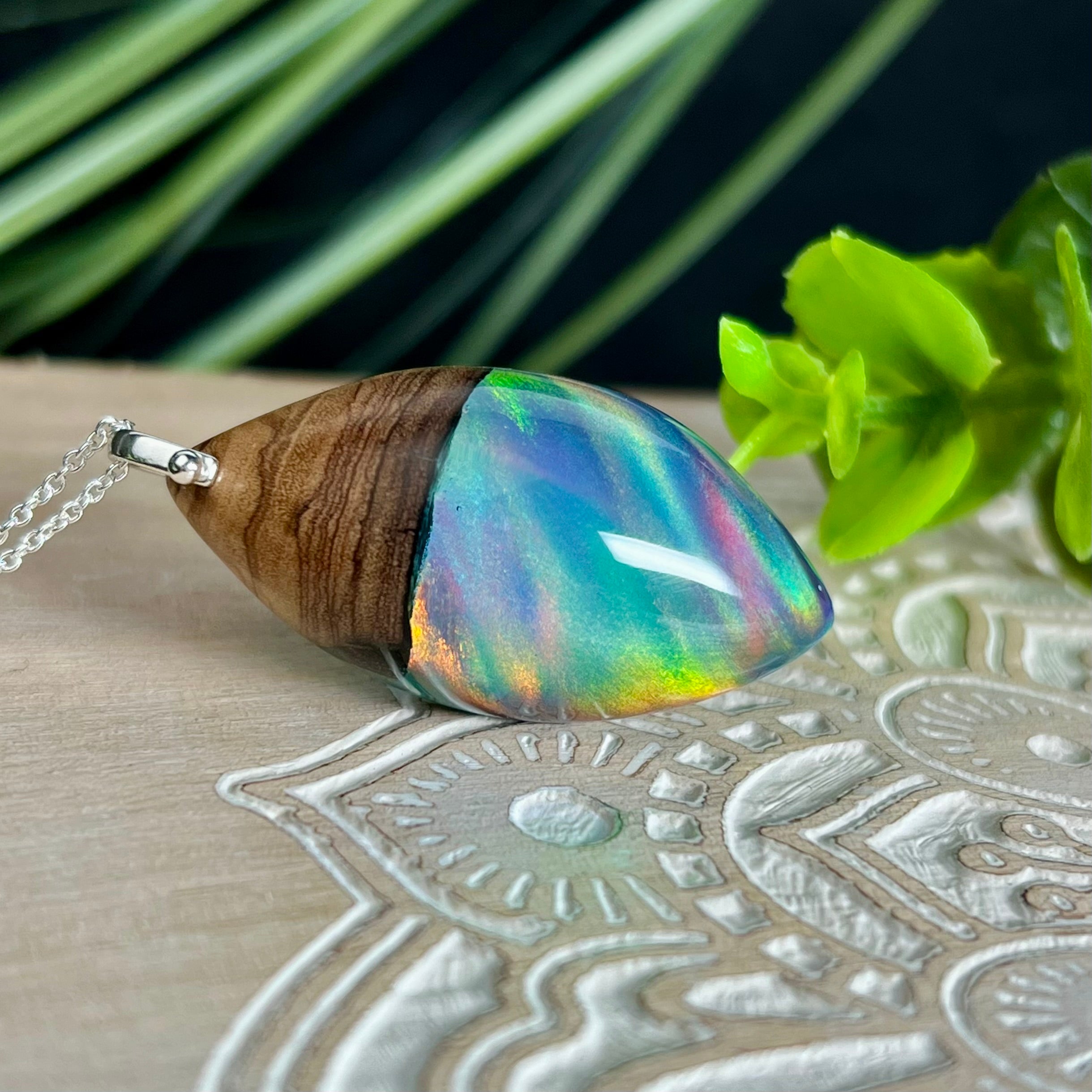 Handgefertigter Anhänger aus Olivenholz, Harz & Labor-Opal mit Aurora-Borealis-Schimmer, 925-Silberkette, einzigartiges Design , Geschenk