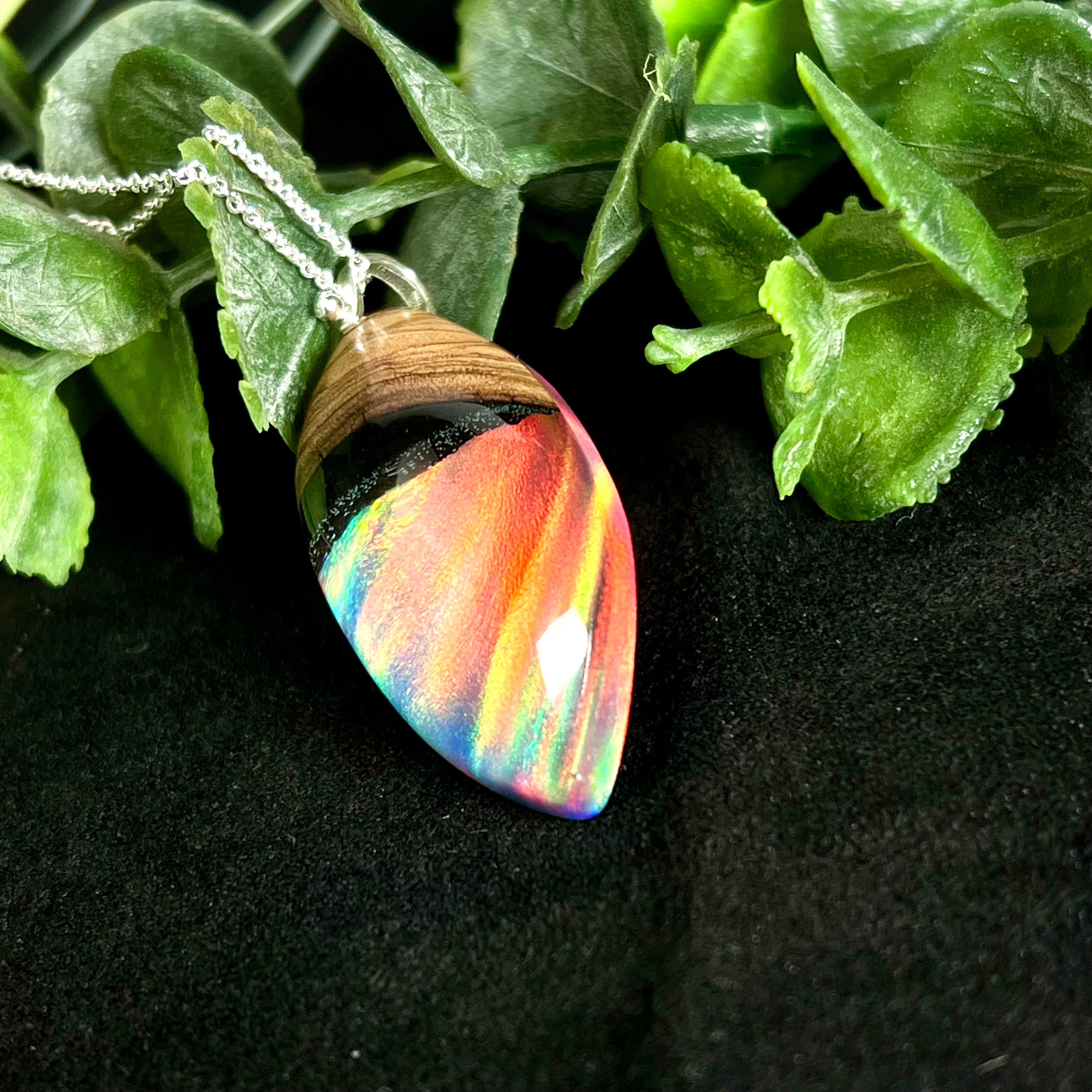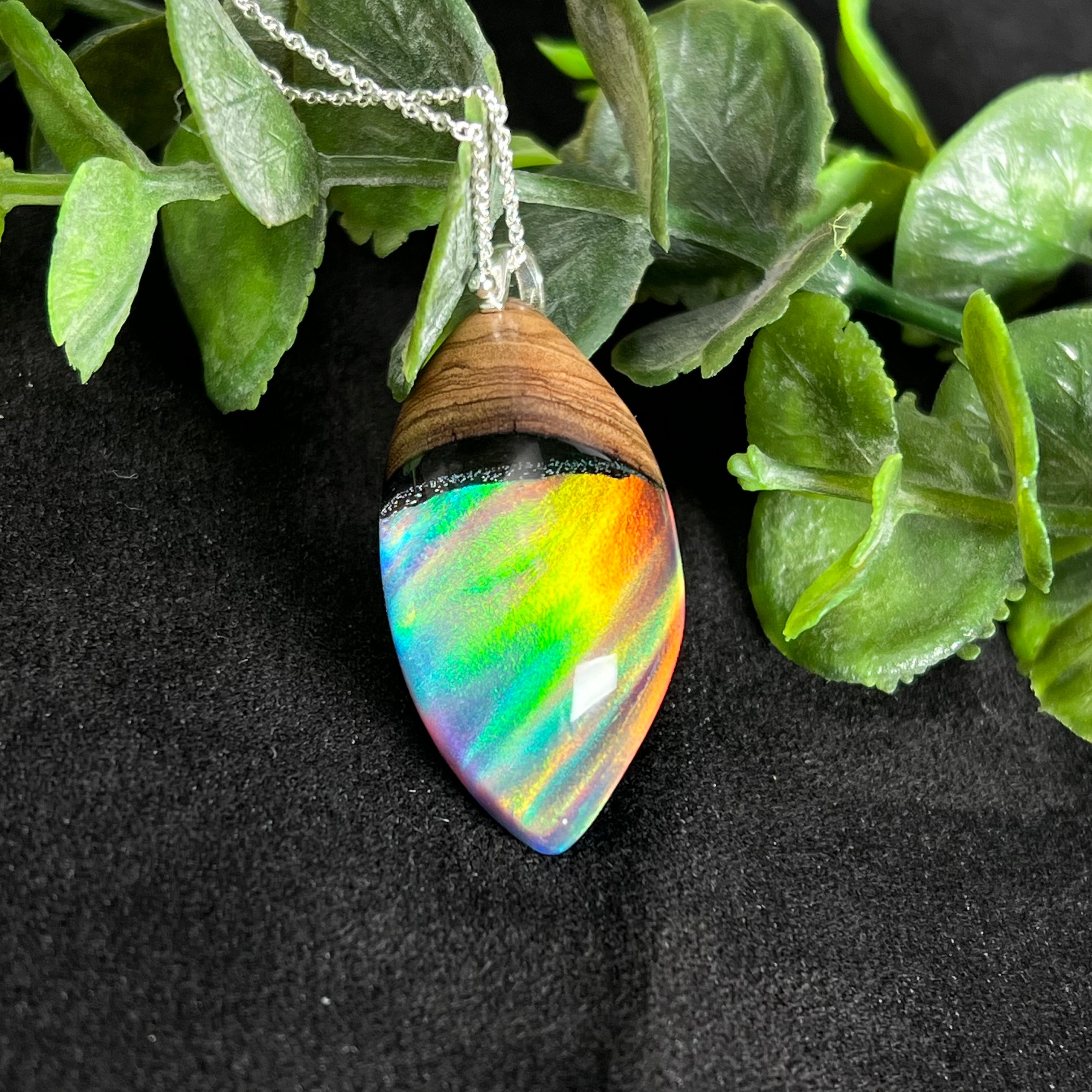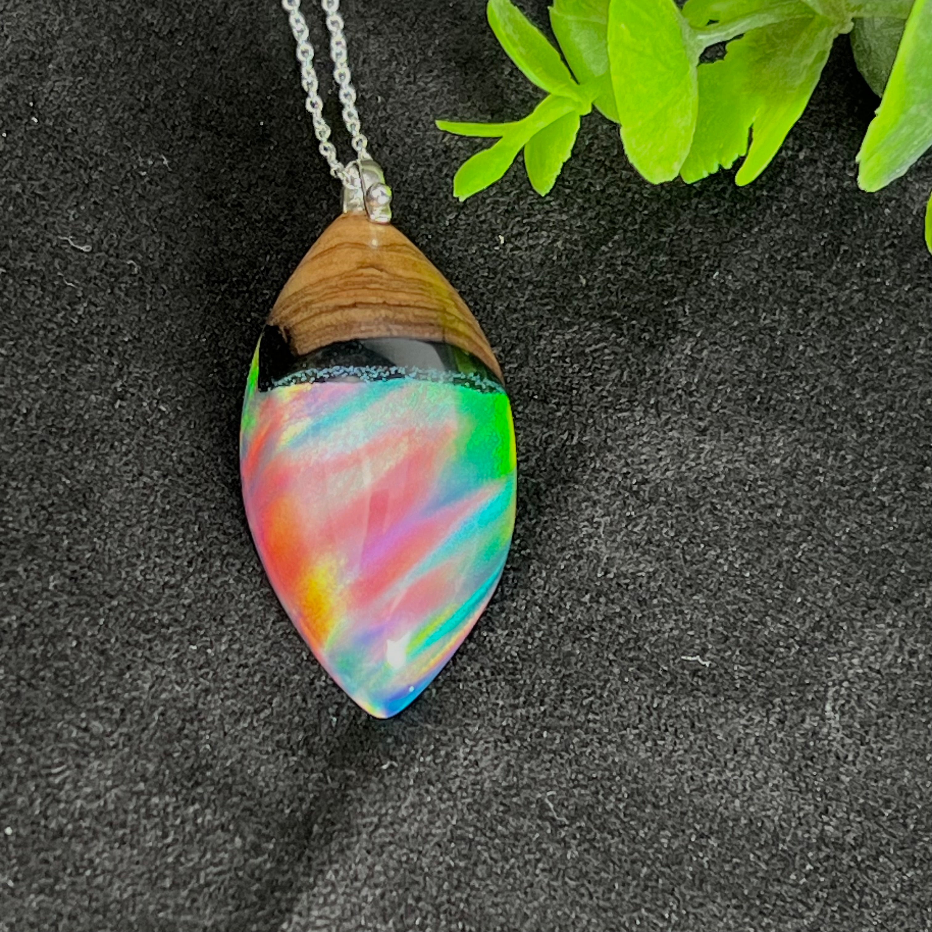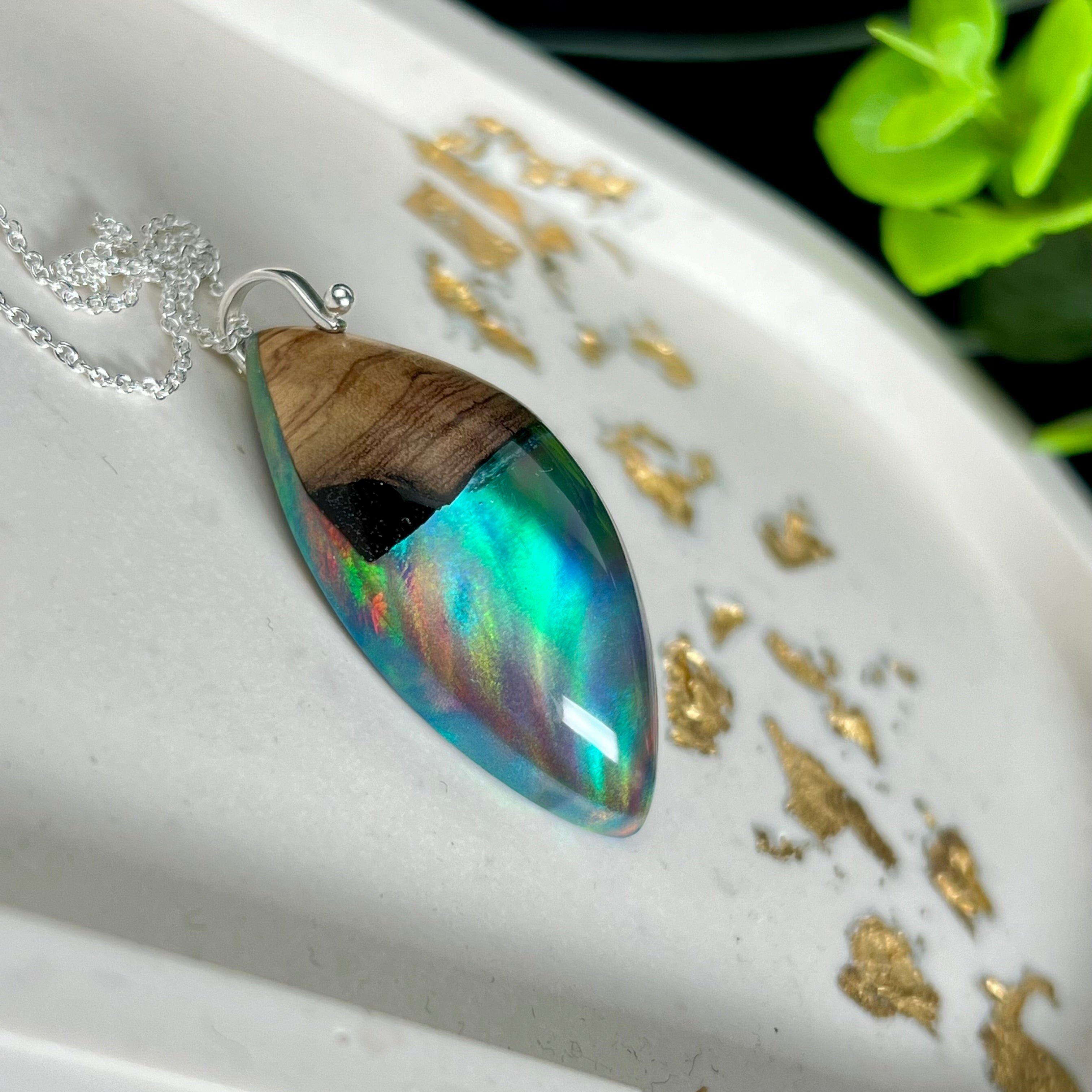 Handgefertigter Anhänger aus Olivenholz, Harz & Labor-Opal mit Aurora-Borealis-Schimmer, 925-Silberkette, einzigartiges Design , Geschenk