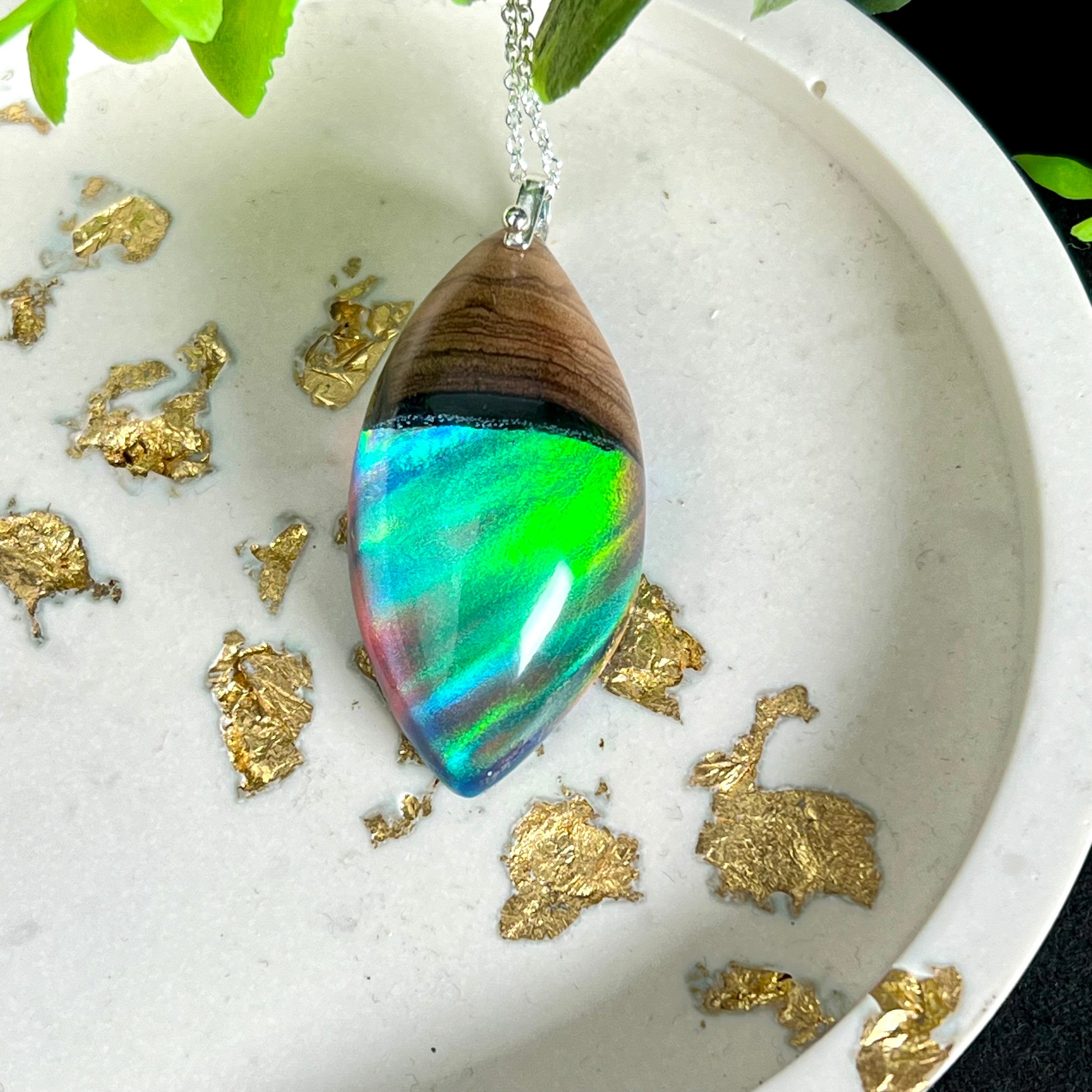 Ein kunstvolles Zusammenspiel aus Olivenholz, Harz und Labor-Opal: Ihr einzigartiger Anhänger mit magischem Aurora-Borealis-Schimmer