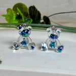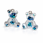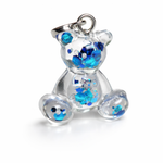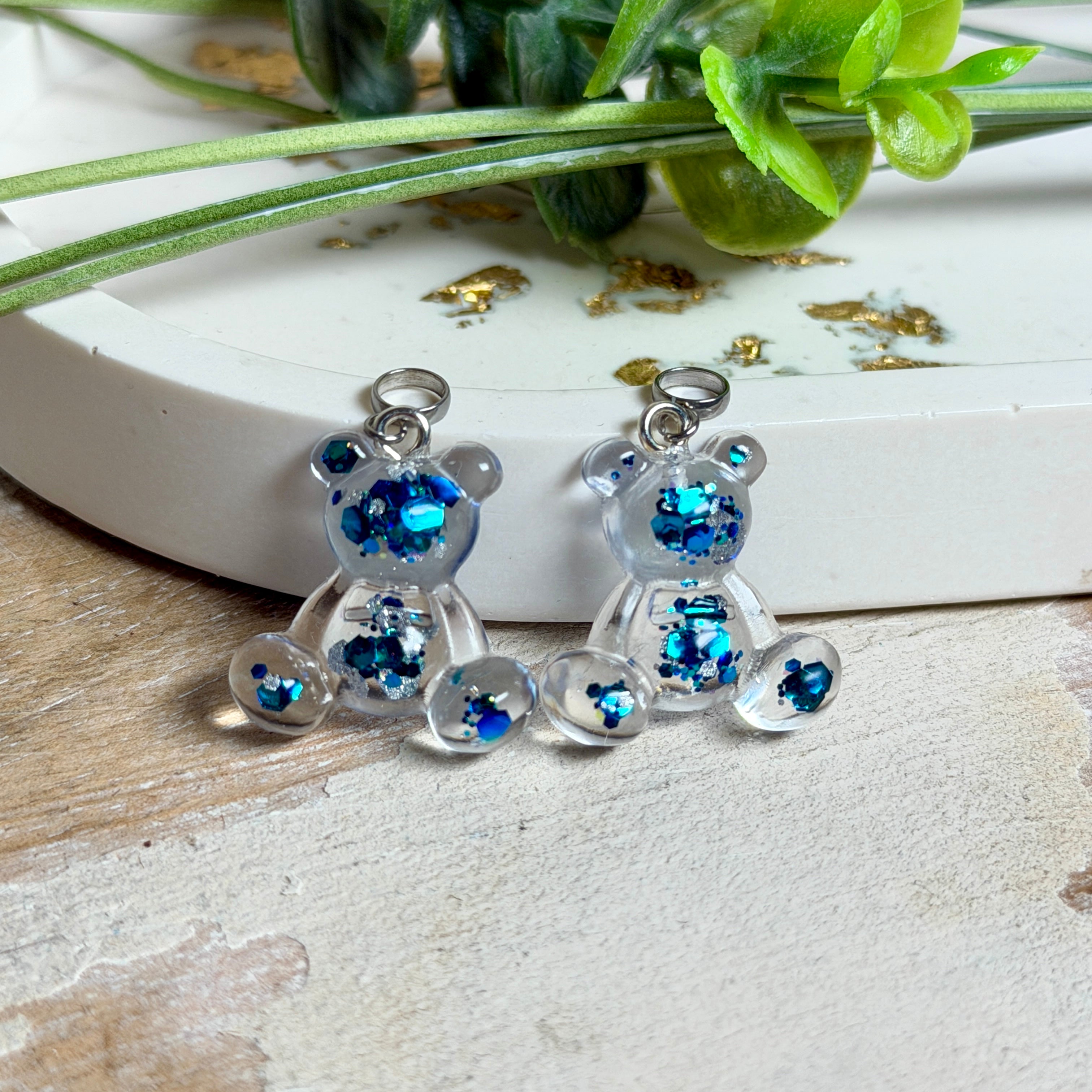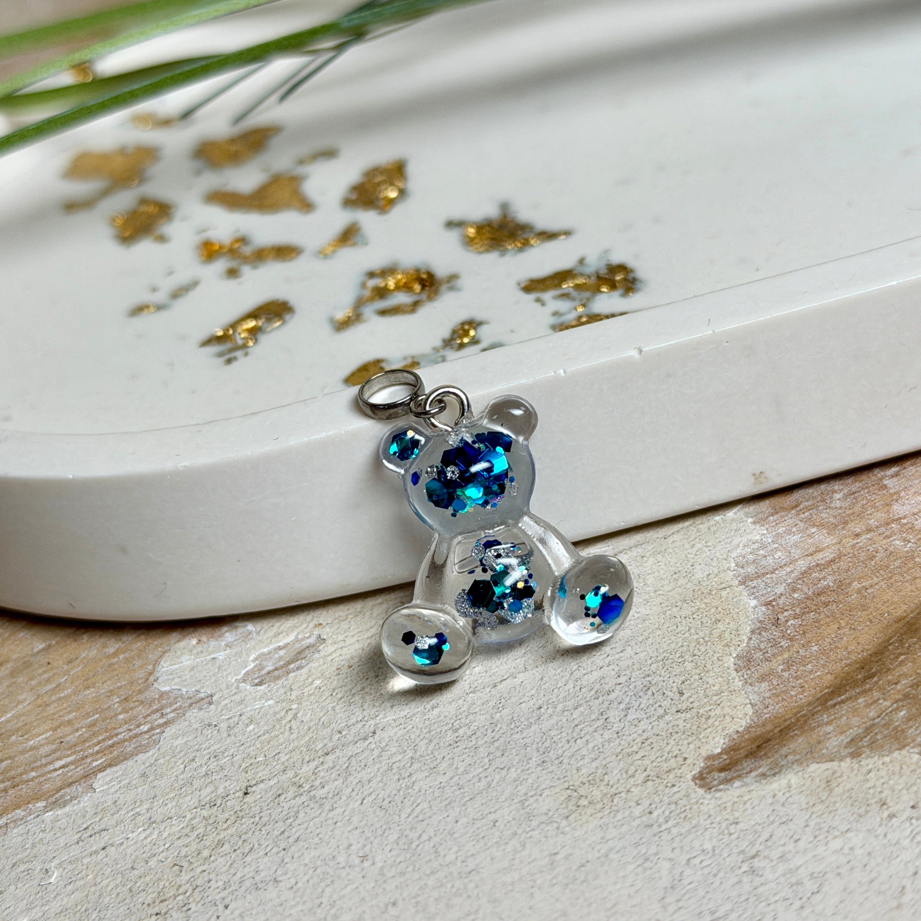Bärchen-Anhänger aus Harz – Blaue Holoflakes (Edelstahlöse)