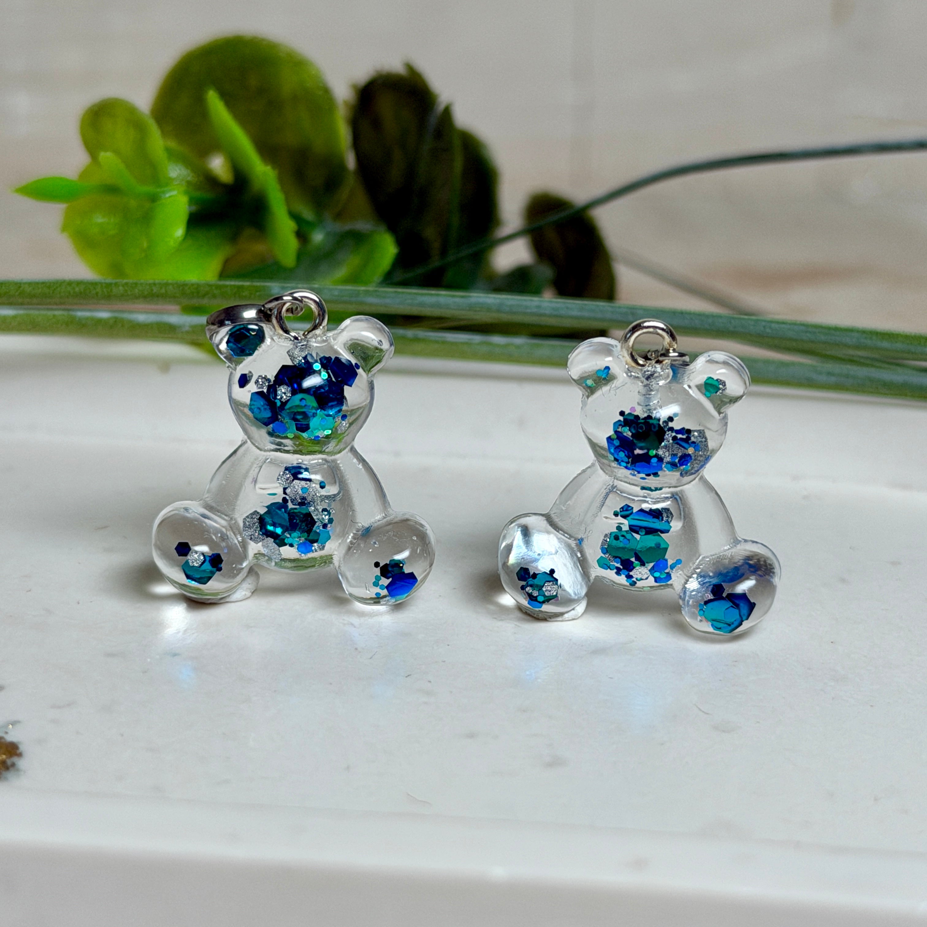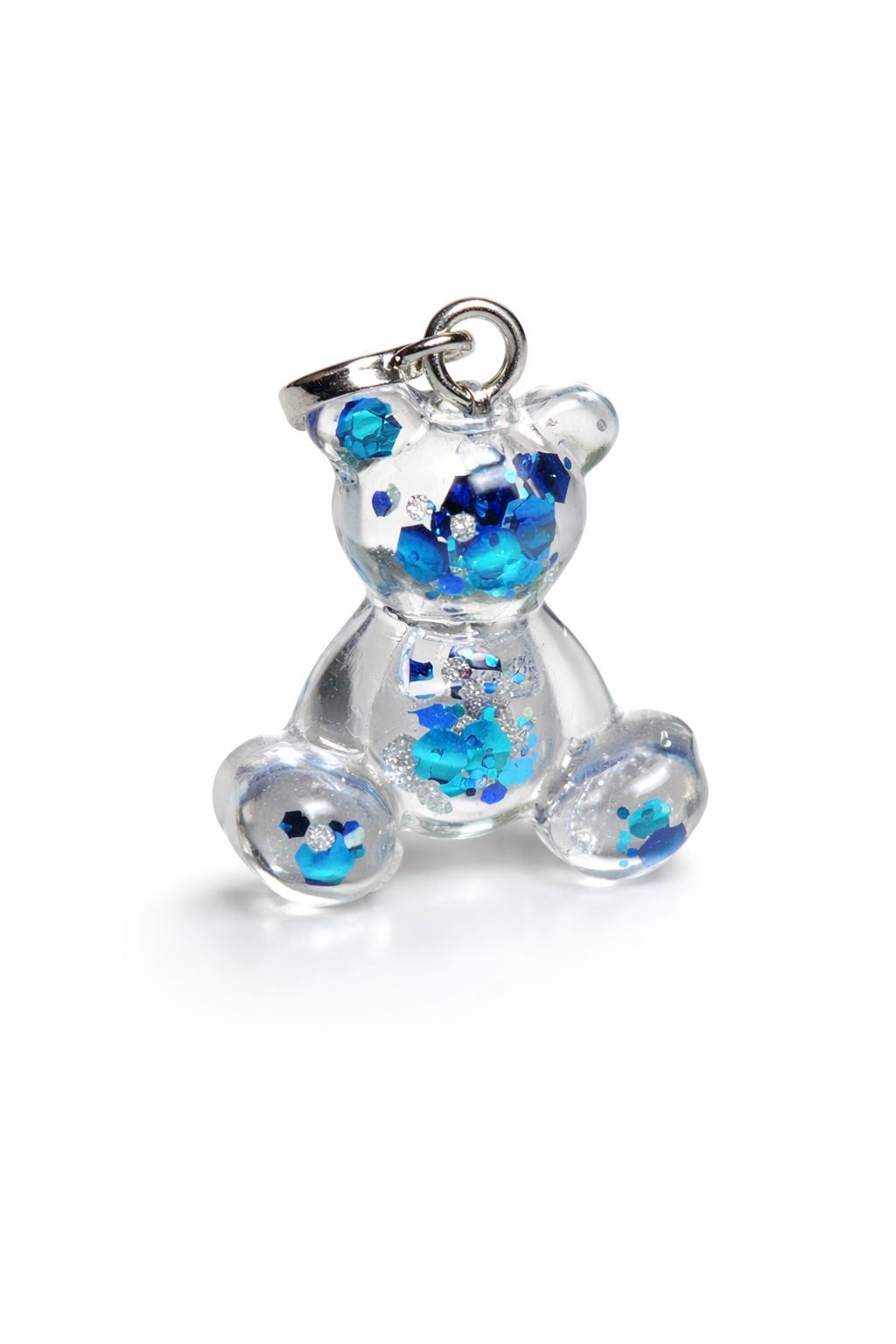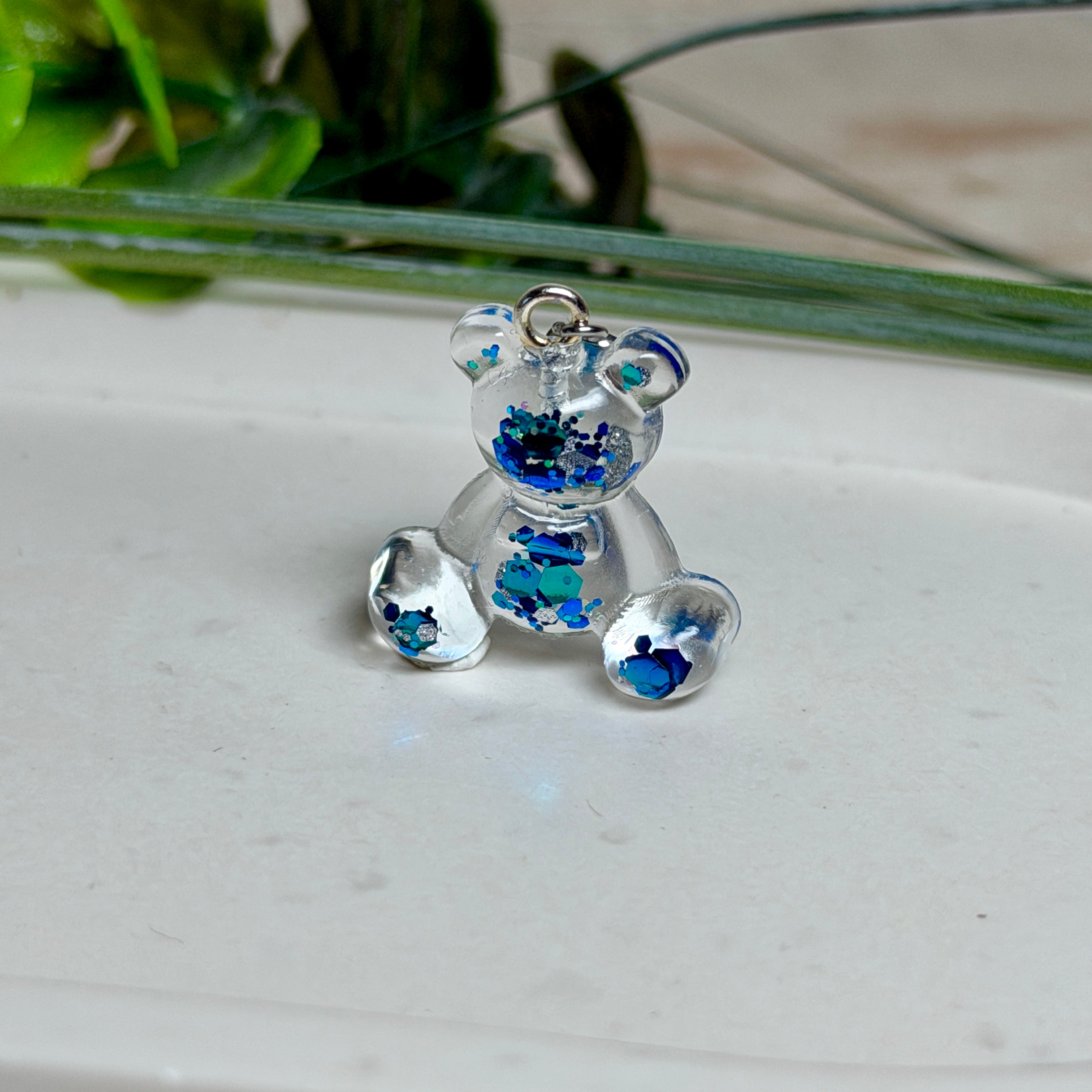 Ein kleines Bärchen, das erwachsenentauglich bleibt: klar gegossenes Harz, darin schimmern Holoflakes in verschiedenen Blautönen – mal tiefes Ozeanblau, mal helles Eisblau, je nach Licht. Ein süßer Akzent, ohne kitschig zu wirken.