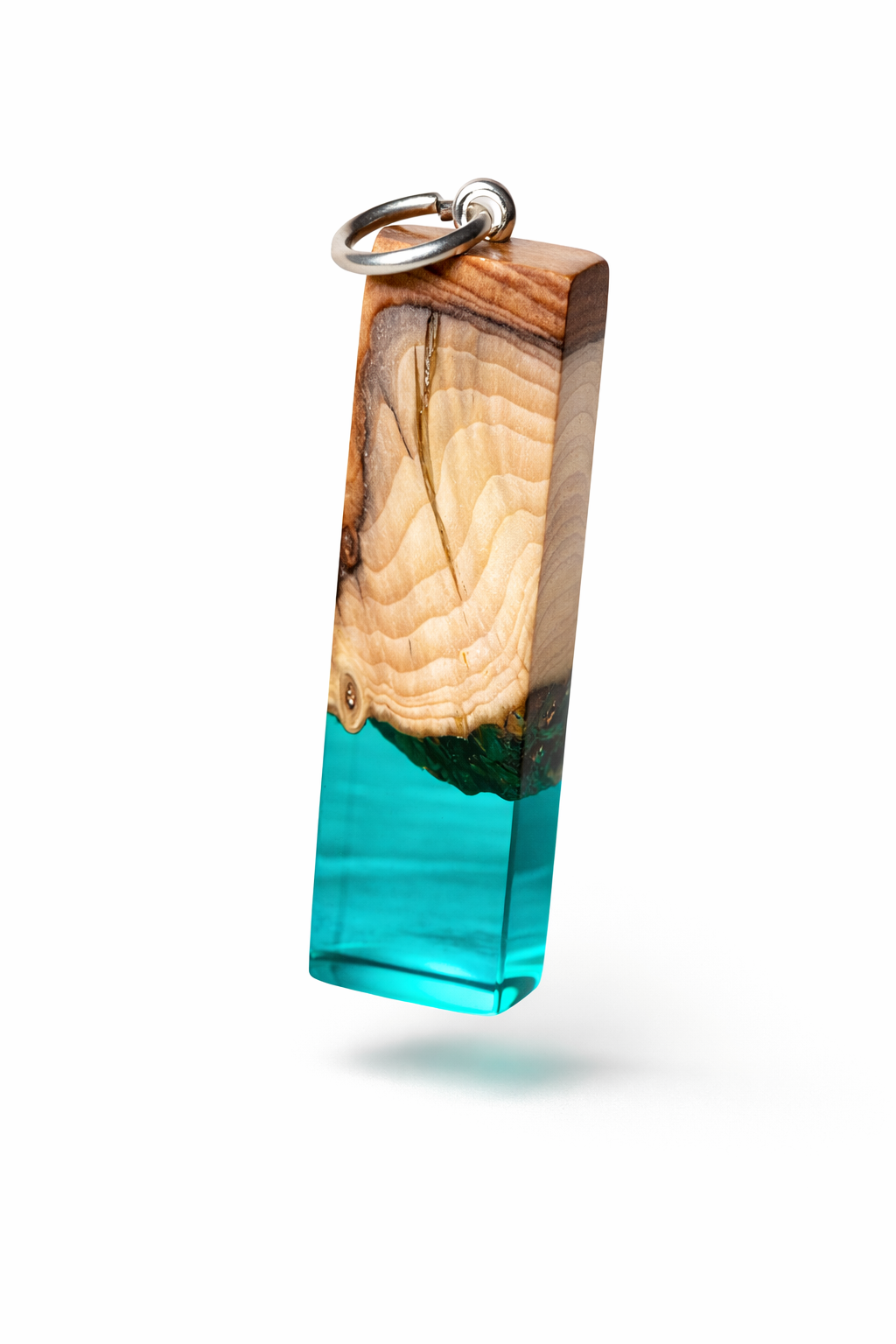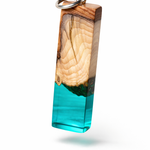 ,,Blue Essence“ Dieser einzigartige handgefertigte Schmuckanhänger kombiniert edles, natürlich gemasertes Eibenholz mit klarem, türkisfarbenem Epoxidharz, wodurch ein faszinierendes und harmonisches Design entsteht. Die warmen Holztöne verschmelzen mit dem leuchtenden Harz, das eine atemberaubende Tiefenwirkung erzeugt – inspiriert von den Farben tropischer Lagunen.