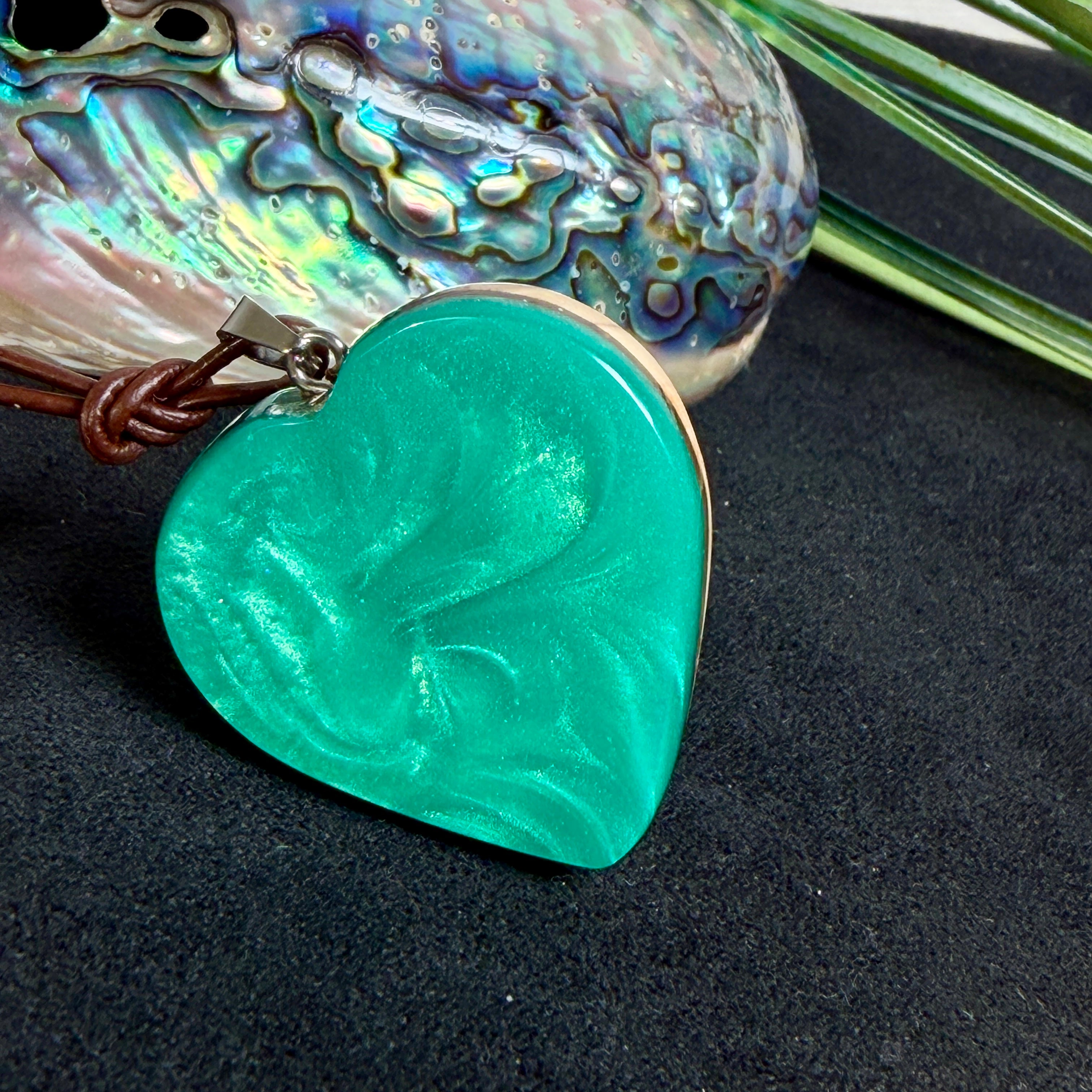 Haben Sie genug von Schmuck in tausendfacher Auflage? Dieser Herzanhänger ist ein kleines Stück Meer zum Tragen: warm gemasertes Olivenholz trifft auf schillernde Paua-Muschel in einem Aquamarin-Harzton – wie klares Meerwasser in der Sonne. Je nach Lichteinfall zeigt die Muschel ein faszinierendes Farbspiel in Blau-, Grün- und Perlmutt-Nuancen.