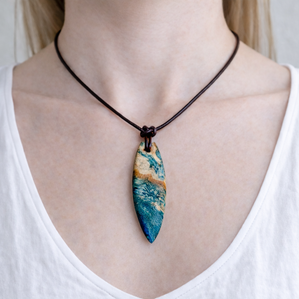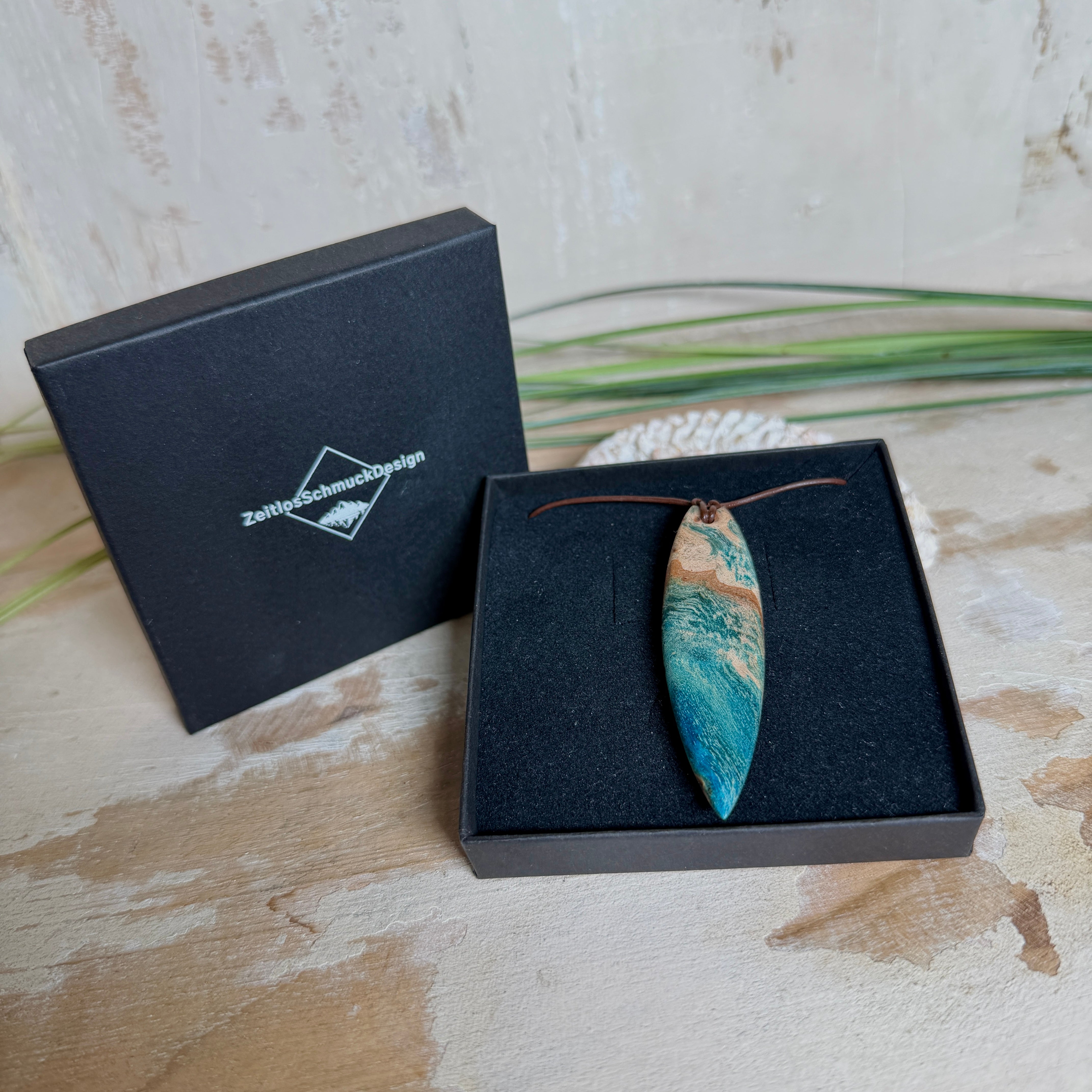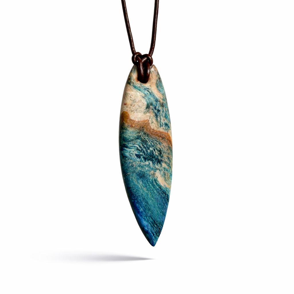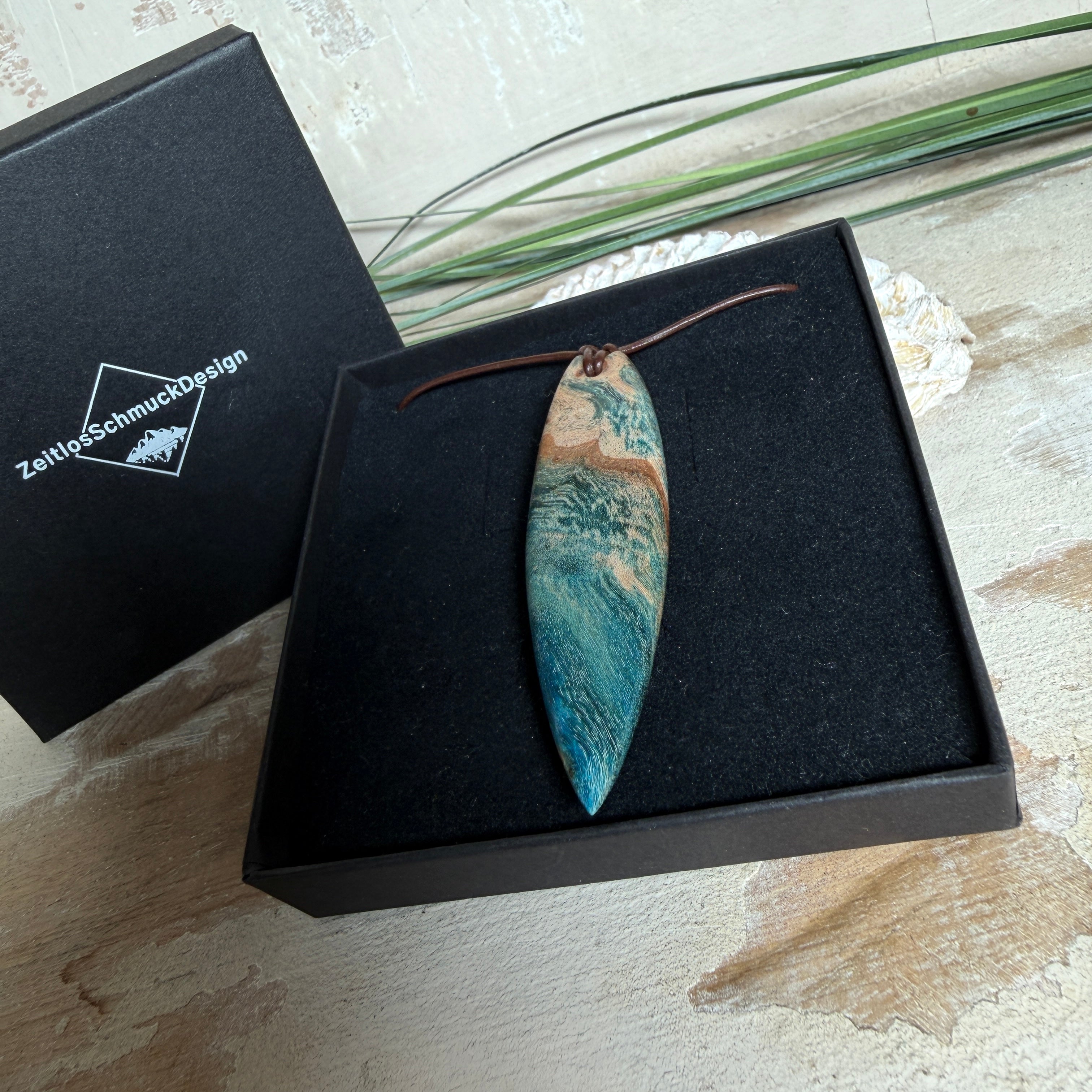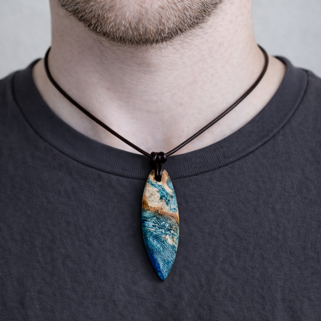 Sie tragen nicht einfach Schmuck – Sie tragen ein Lebensgefühl. Dieser handgefertigte Anhänger verbindet die natürliche Maserung von stabilisiertem Holz mit einem türkisblauen Harzverlauf, der an Wellen, Strömungen und Tiefe erinnert. Schlank, modern und angenehm leicht zu kombinieren – ein Eyecatcher, der trotzdem ruhig wirkt.