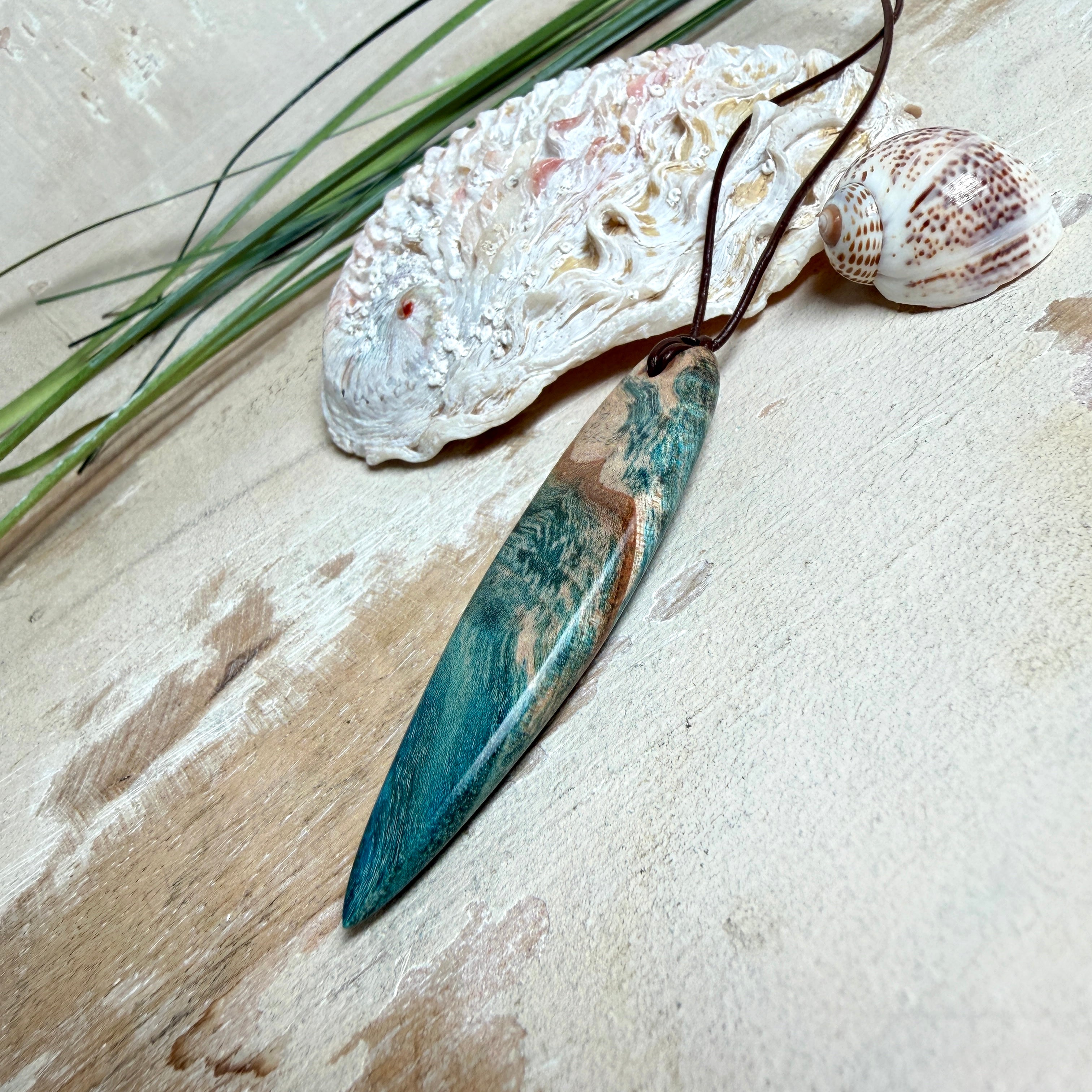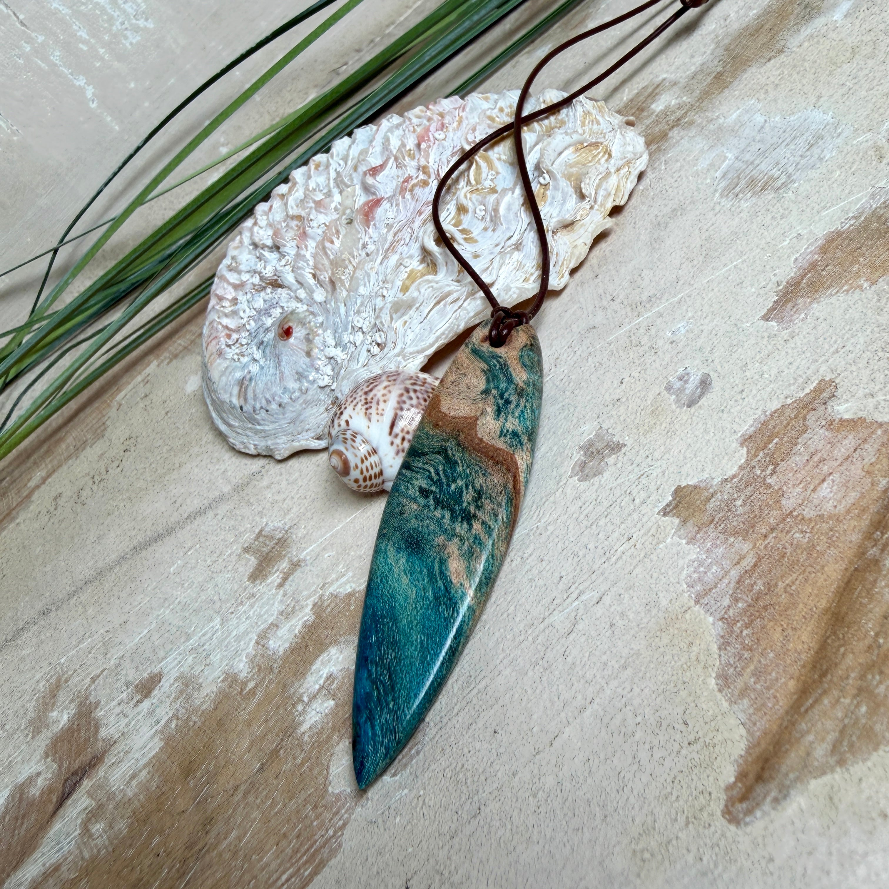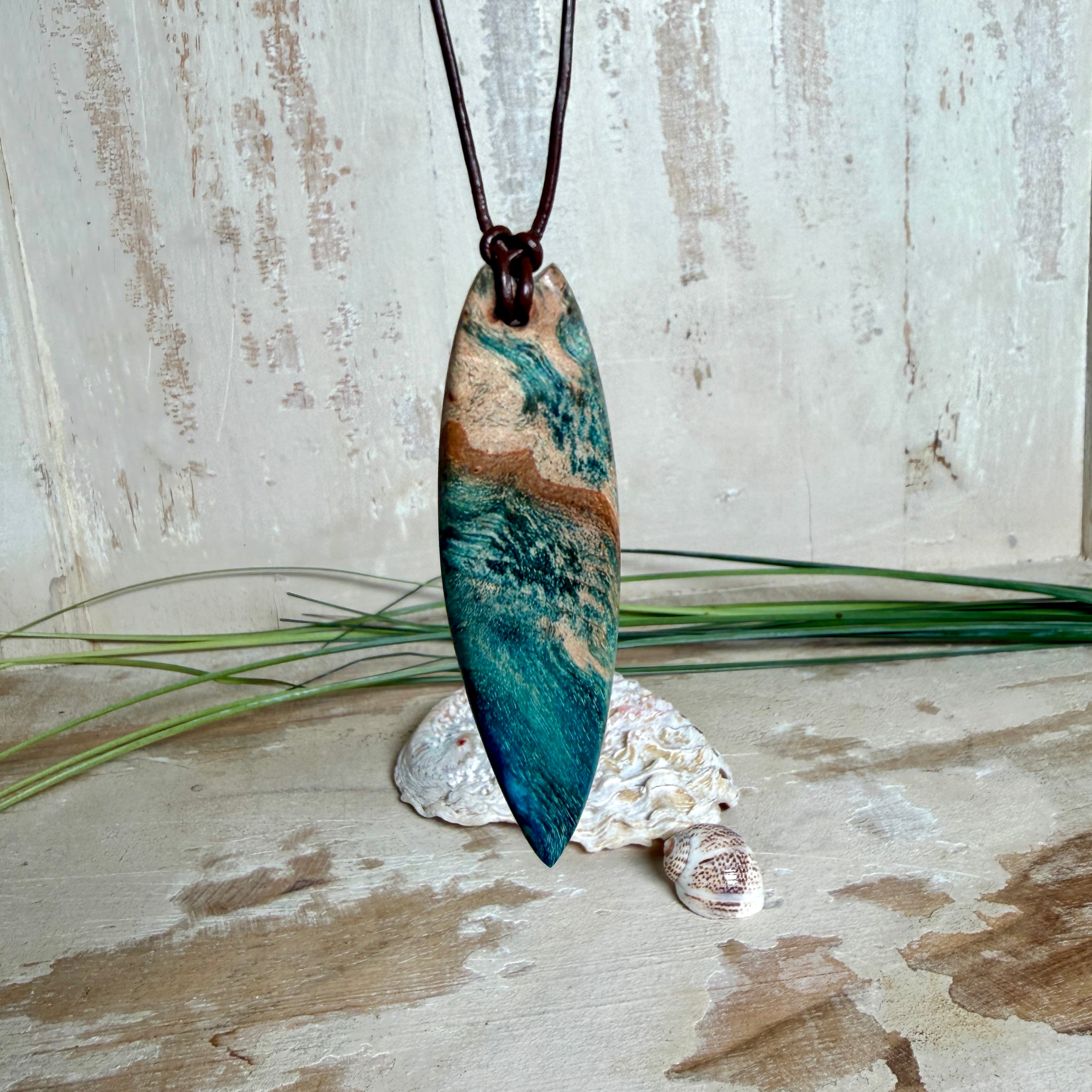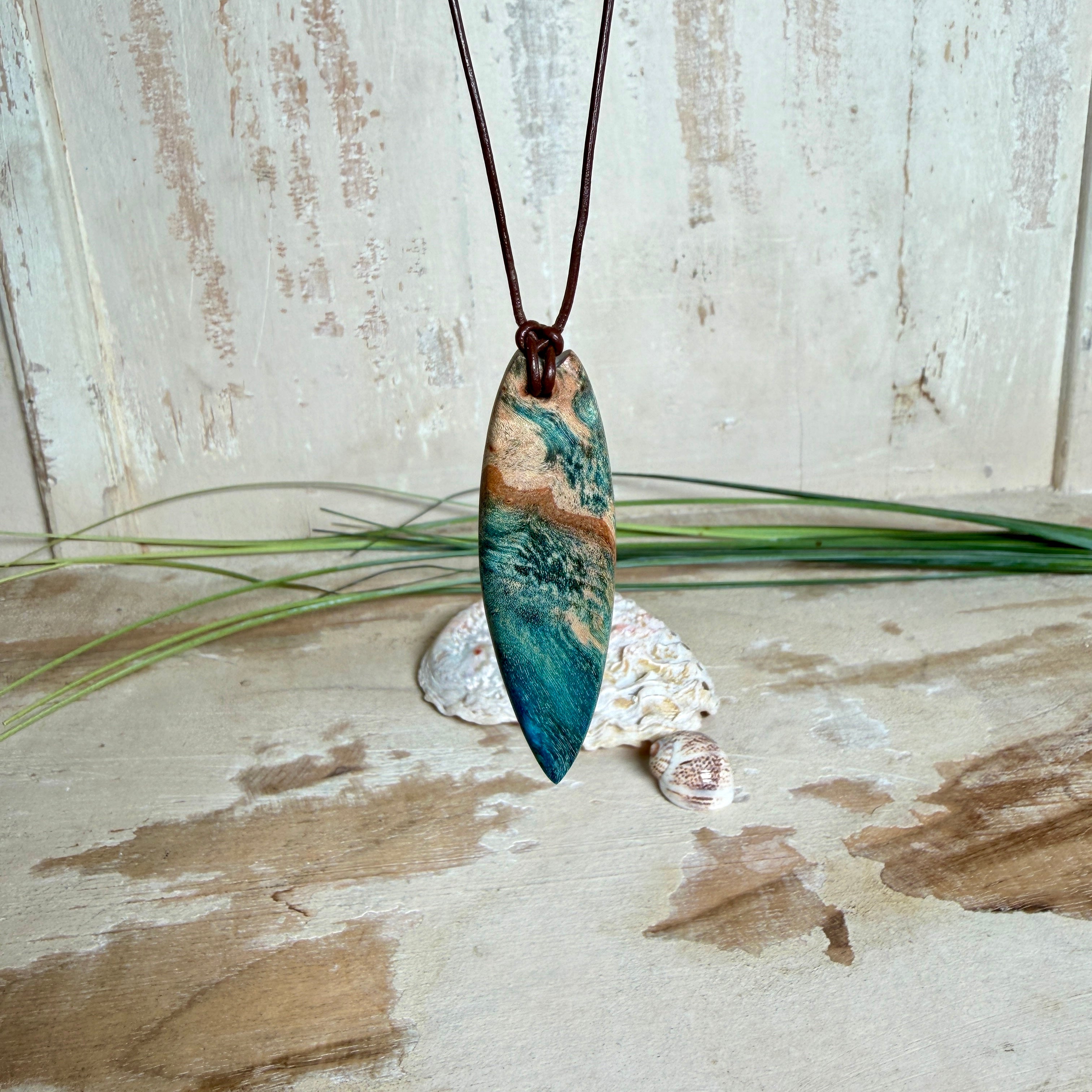 Sie tragen nicht einfach Schmuck – Sie tragen ein Lebensgefühl. Dieser handgefertigte Anhänger verbindet die natürliche Maserung von stabilisiertem Holz mit einem türkisblauen Harzverlauf, der an Wellen, Strömungen und Tiefe erinnert. Schlank, modern und angenehm leicht zu kombinieren – ein Eyecatcher, der trotzdem ruhig wirkt.