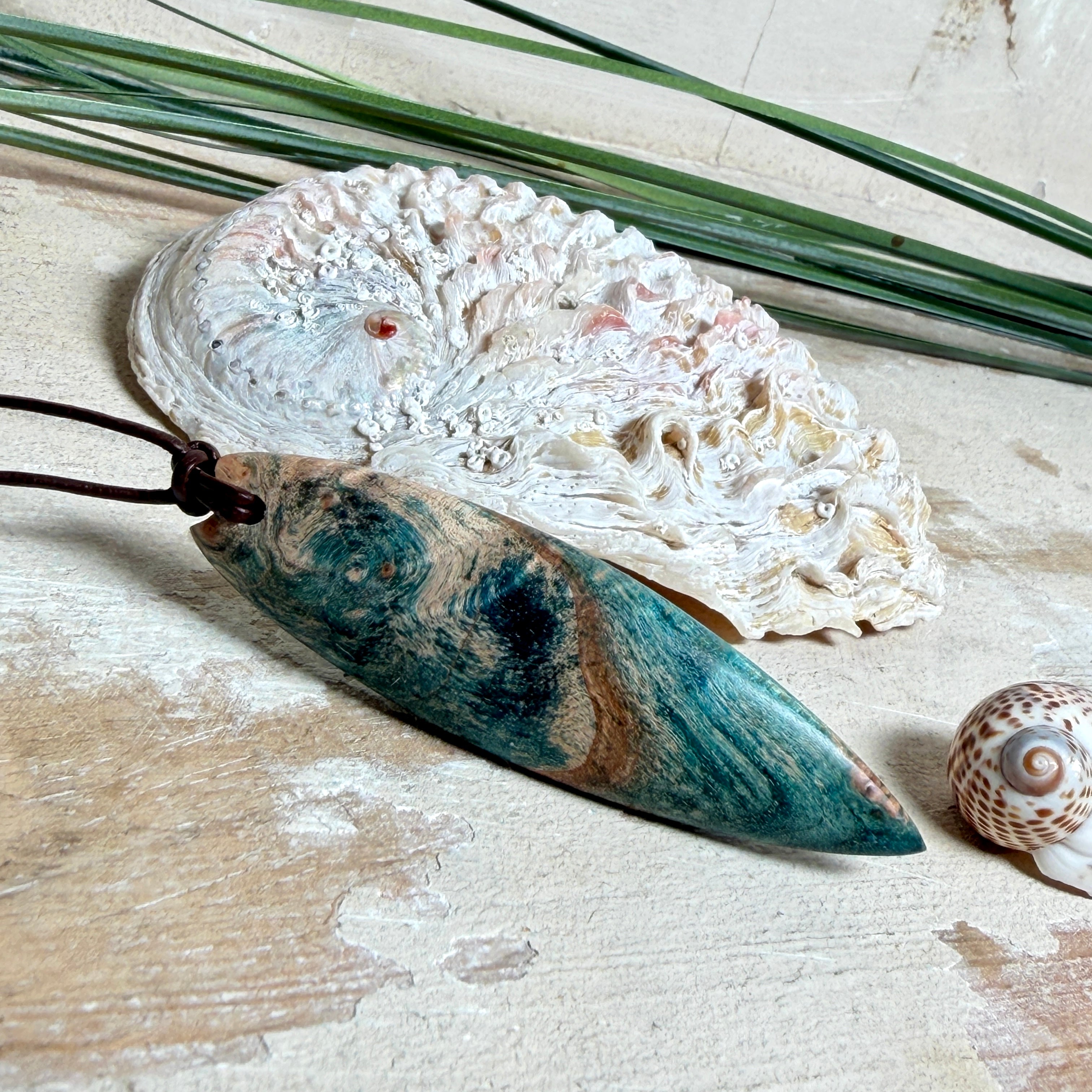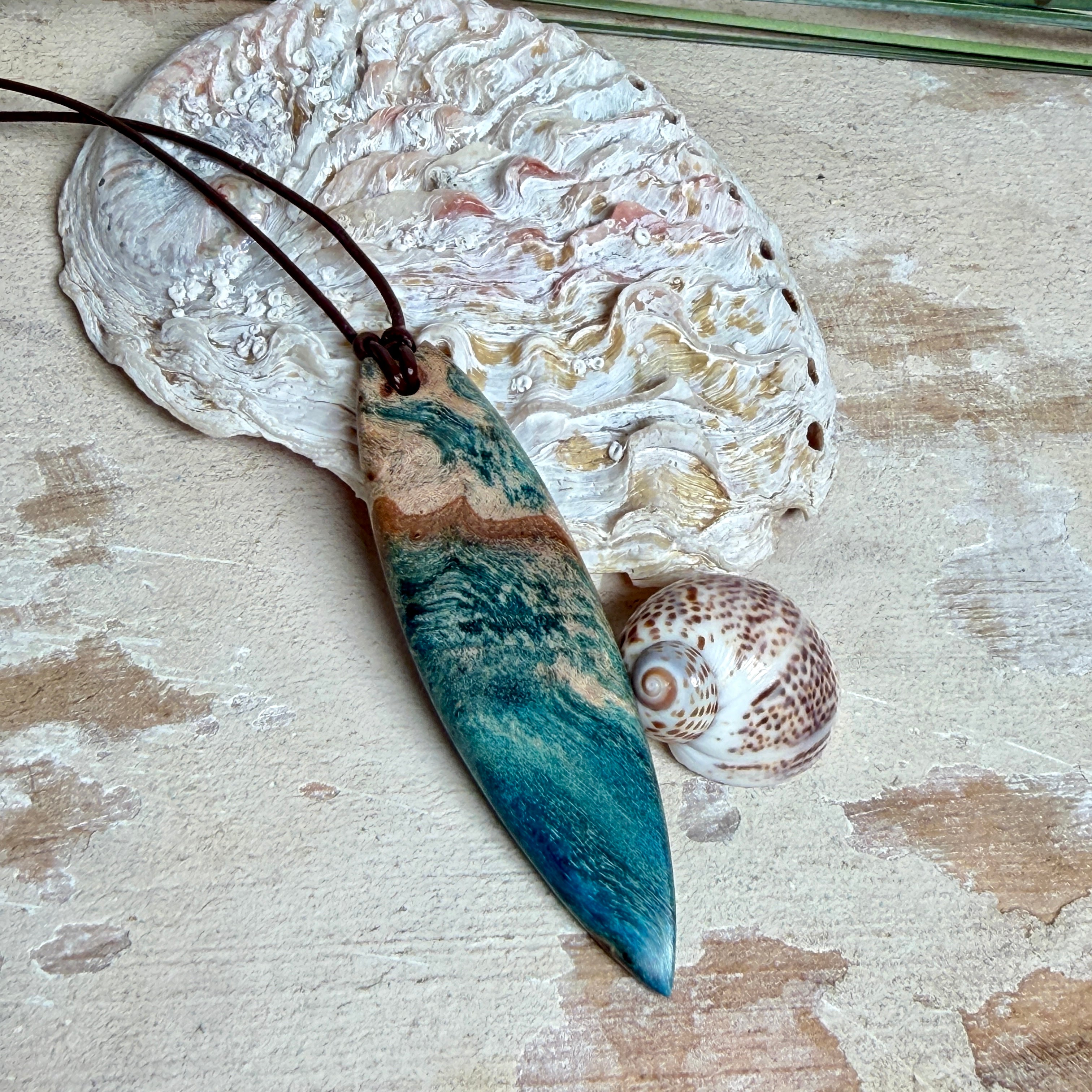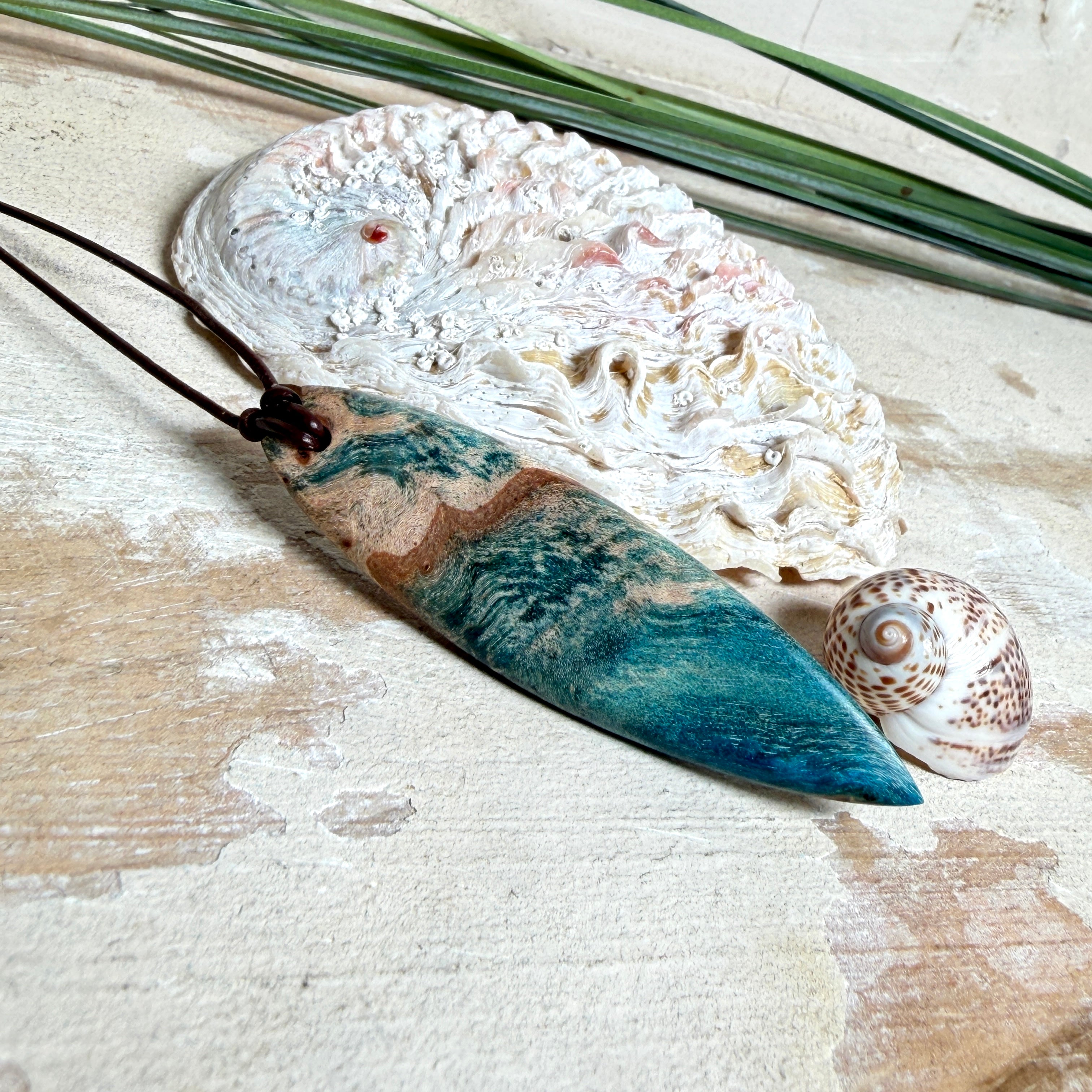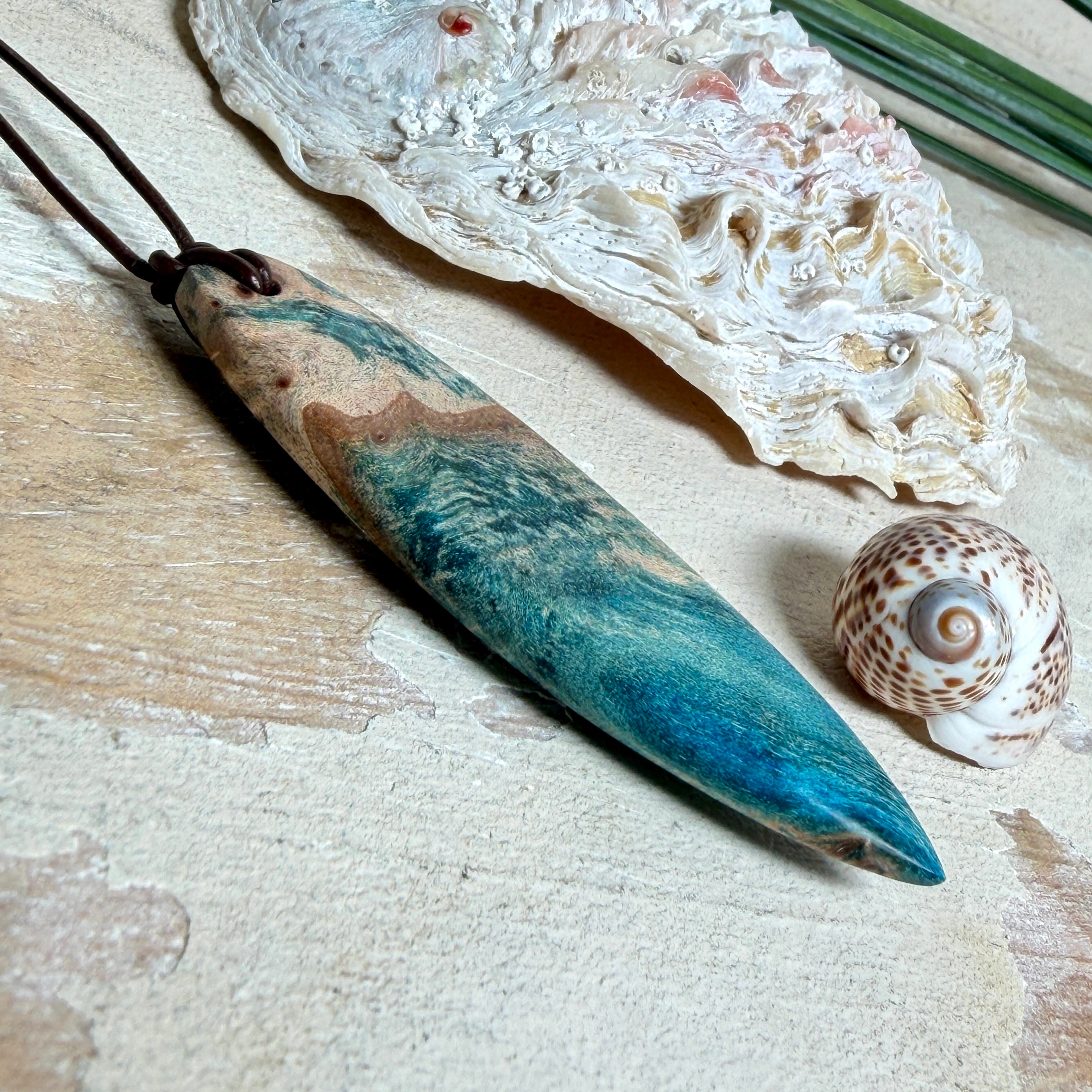 Sie tragen nicht einfach Schmuck – Sie tragen ein Lebensgefühl. Dieser handgefertigte Anhänger verbindet die natürliche Maserung von stabilisiertem Holz mit einem türkisblauen Harzverlauf, der an Wellen, Strömungen und Tiefe erinnert. Schlank, modern und angenehm leicht zu kombinieren – ein Eyecatcher, der trotzdem ruhig wirkt.