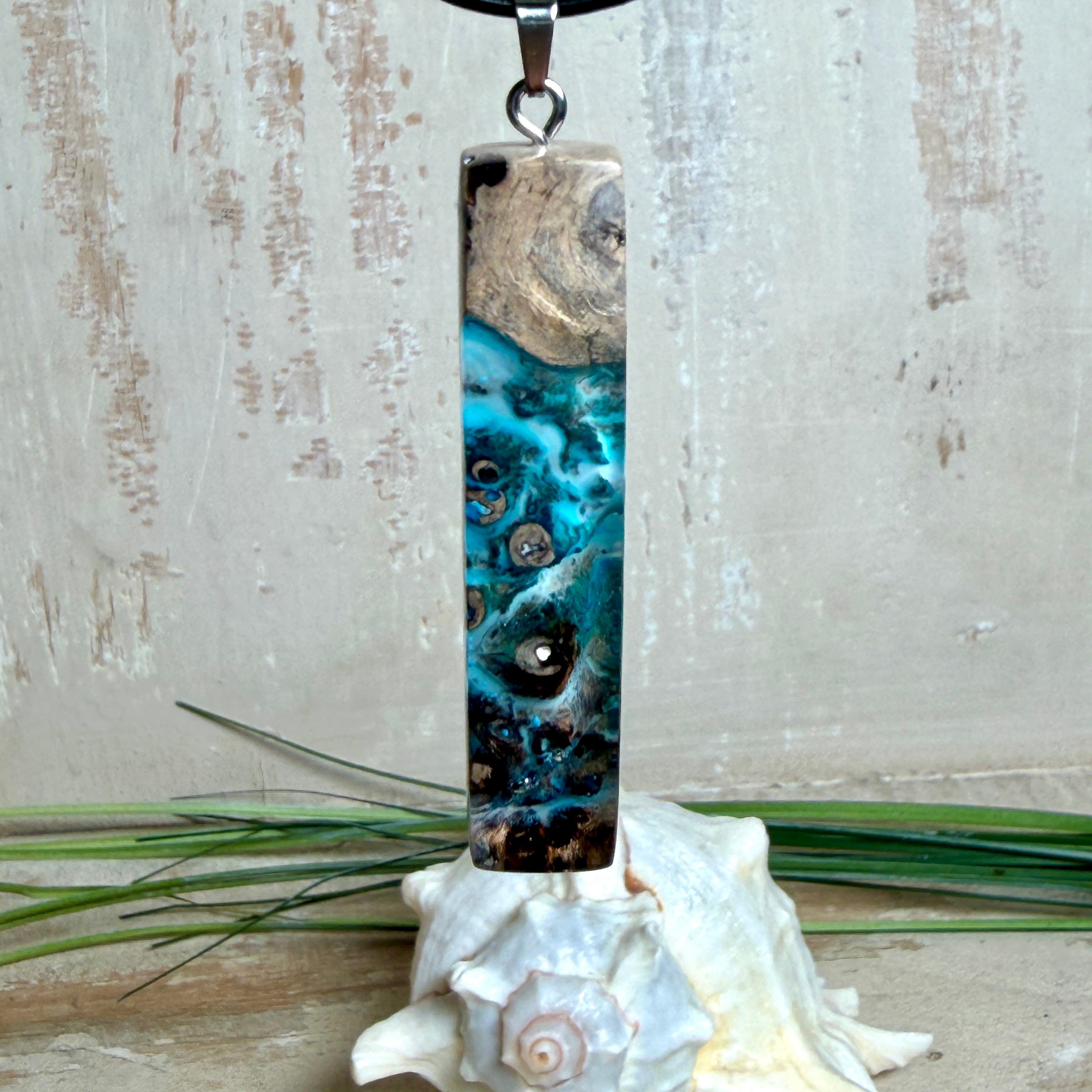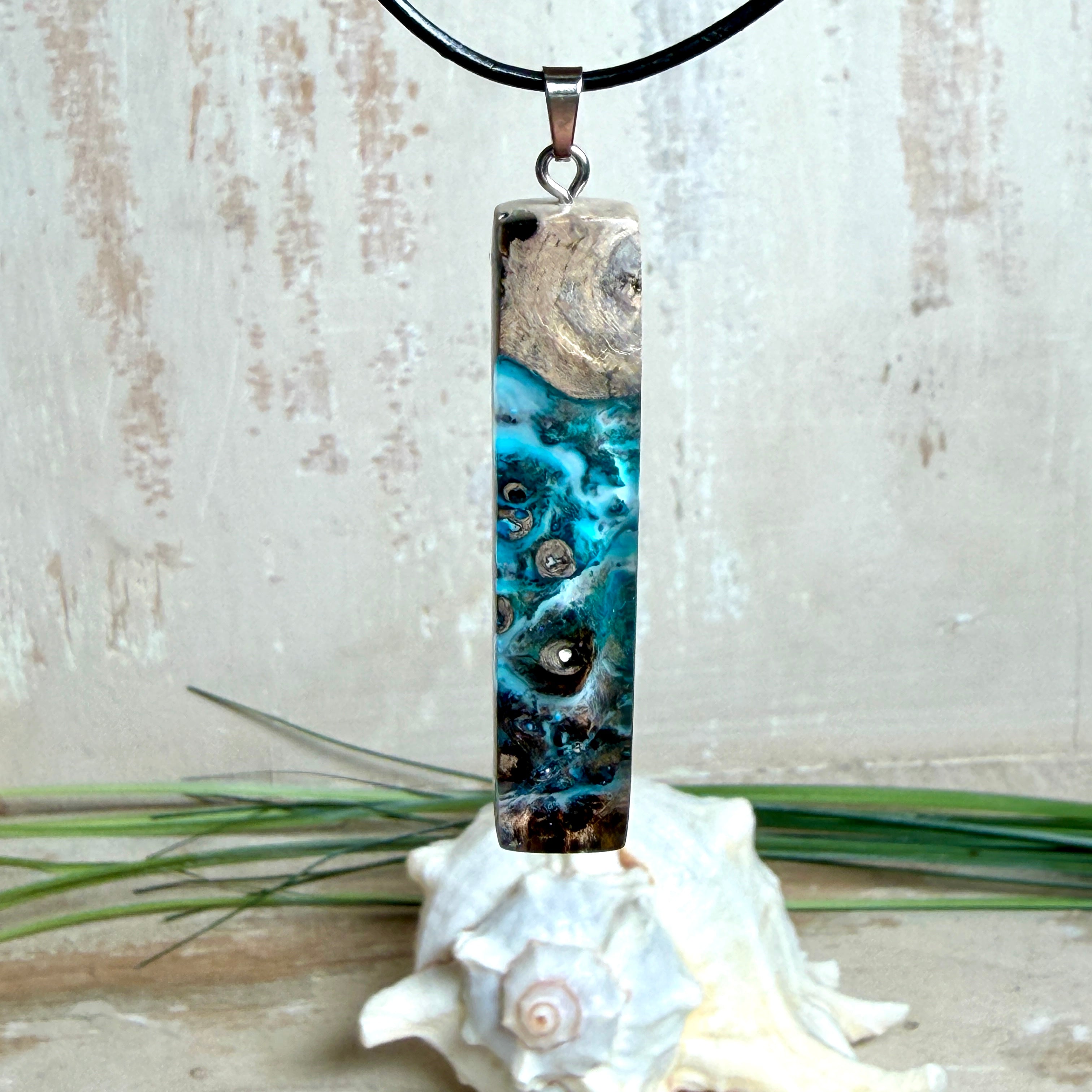 Rechteckiger Stabanhänger aus Maserholz und glasklarem Epoxidharz in tiefen Blau- und Türkistönen mit organischer Lagunen/Riff-Optik. Hochglanzpoliert, ca. 5,3 × 1,2 cm. Der Anhänger hängt an einer schwarzen Lederkette mit Edelstahl-Karabiner und 5-cm-Verlängerung (45 + 5 cm); die Anhängerschlaufe ist ebenfalls aus Edelstahl. Handgefertigtes Unikat, Lieferung in edler Schmuckbox – maritimer Look.