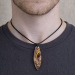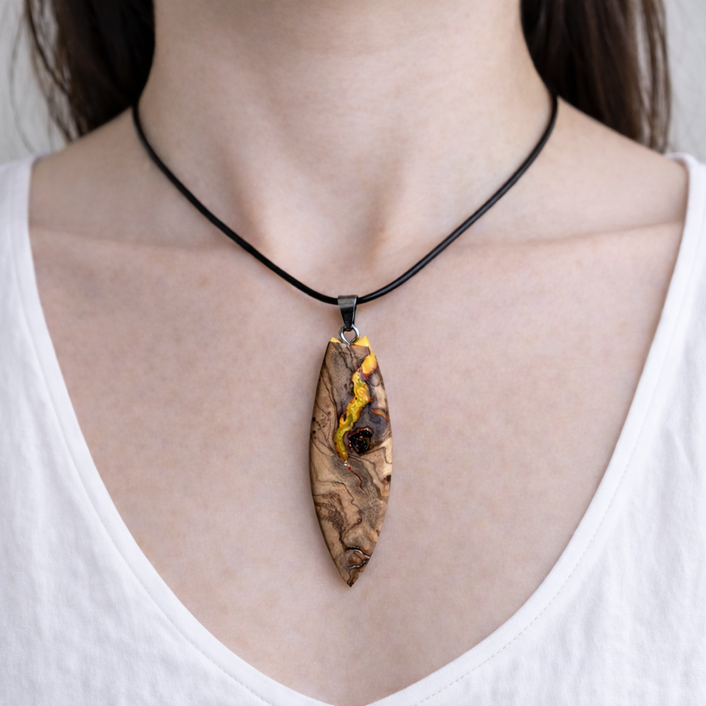 Jeder Anhänger wird in sorgfältiger Handarbeit gefertigt. Die Kombination von Olivenholz und Harz macht jedes Stück einzigartig: Maserung, Farbverläufe und der Leuchteffekt unterscheiden sich leicht und verleihen jedem Anhänger eine individuelle Ausstrahlung.