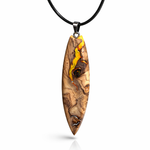 Dieser exklusive Surfbrett-Anhänger vereint handverlesenes Olivenholz mit fluoreszierendem Harz in Gelb-Orange. Unter Schwarzlicht beginnt das Harz zu leuchten und macht den Anhänger zu einem faszinierenden Highlight.