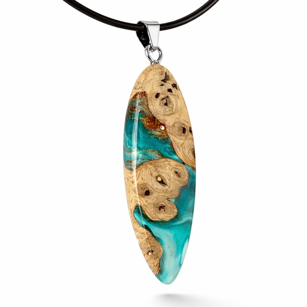 Diese handgefertigte Surfbrett Kette verbindet warmes Maserholz mit türkisfarbenem Resin und bringt die Farben des Meeres in ein besonderes Schmuckstück. Durch die natürliche Maserung des Holzes und den individuellen Verlauf des Resins ist jeder Anhänger ein echtes Einzelstück.