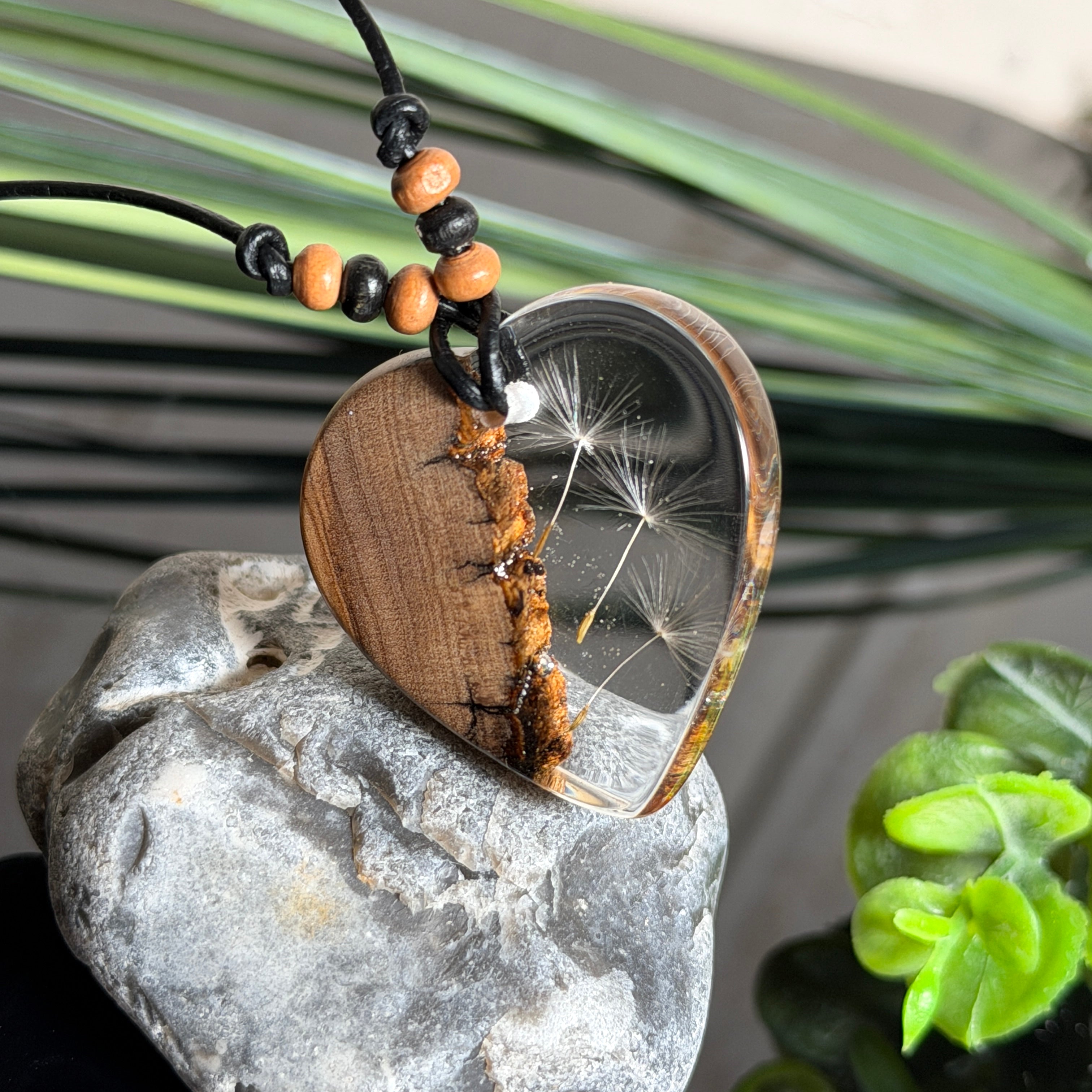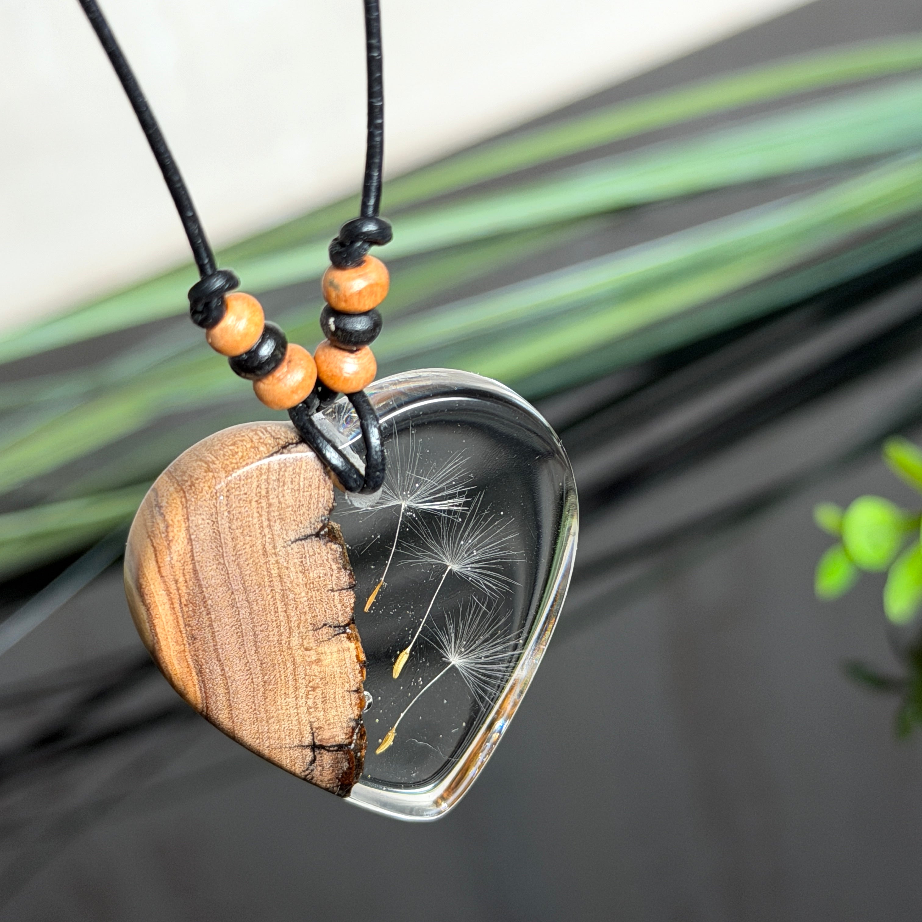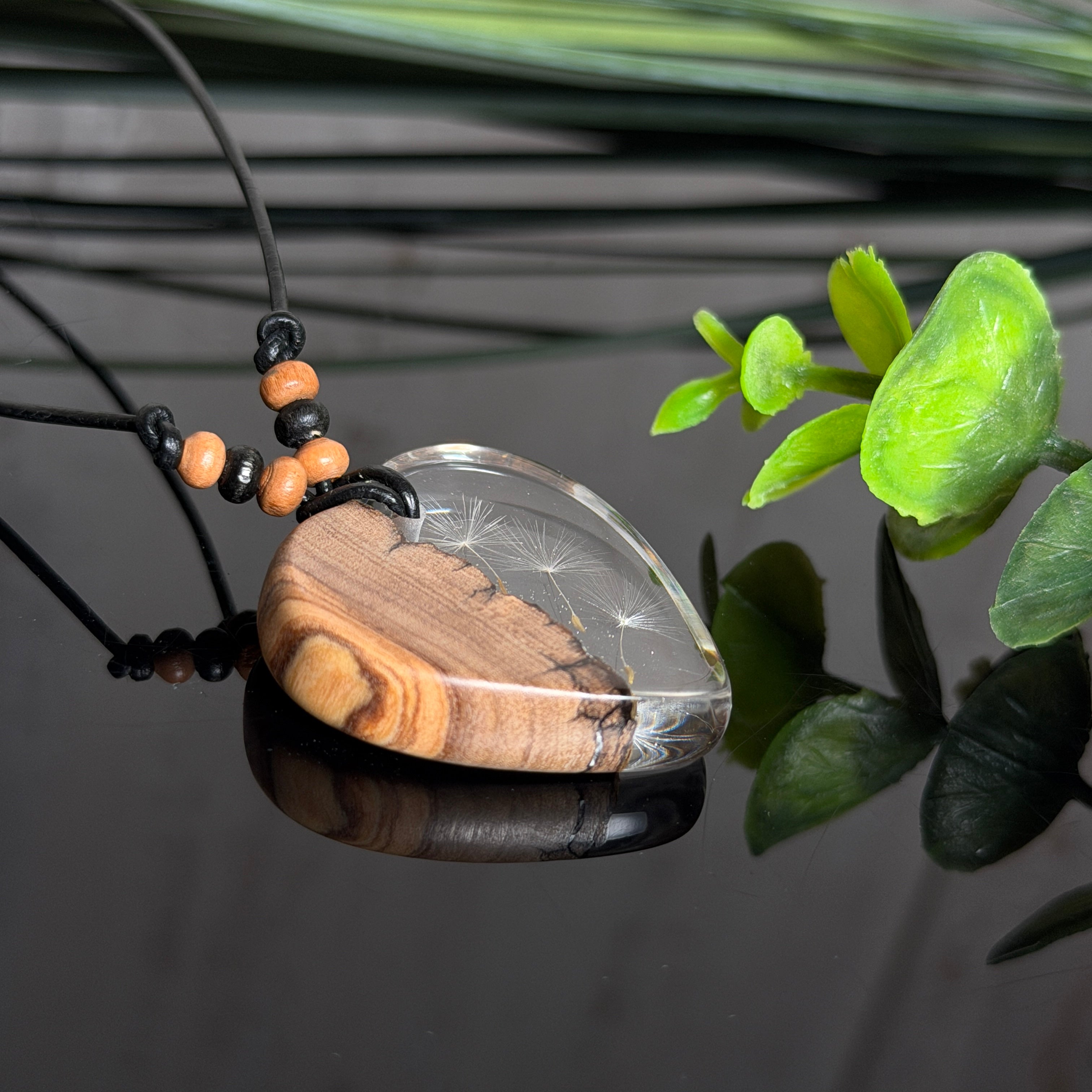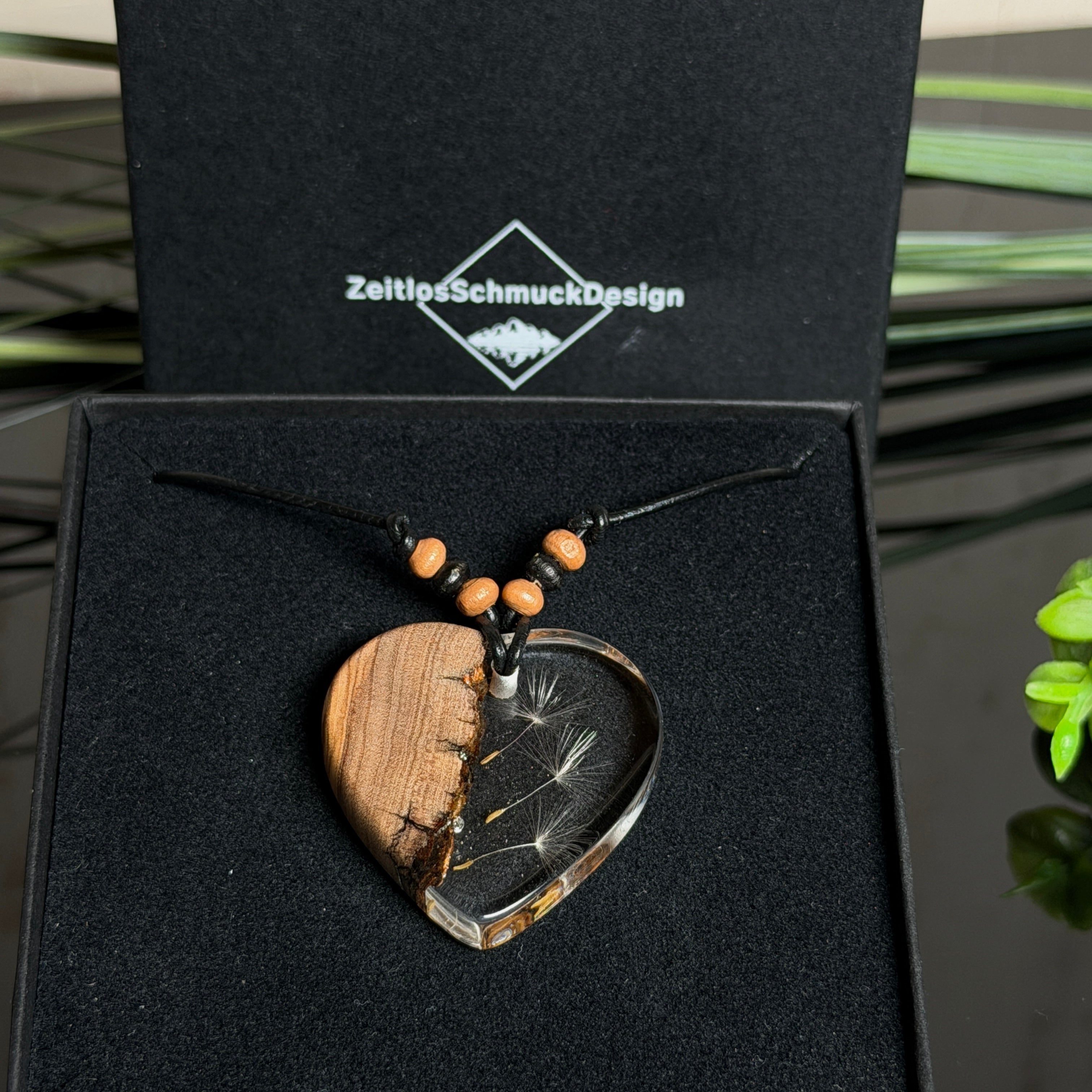 Pusteblumen Herzanhänger aus Olivenholz und Harz