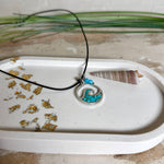 Gefasst in Edelstahl und getragen an einer schwarzen Lederkette mit Edelstahl-Karabiner und Verlängerungskette, verbindet dieses Schmuckstück moderne Klarheit mit maritimem Design. Leicht, alltagstauglich und zugleich aussagekräftig – ideal für alle, die Wasser, Weite und besondere Details lieben.