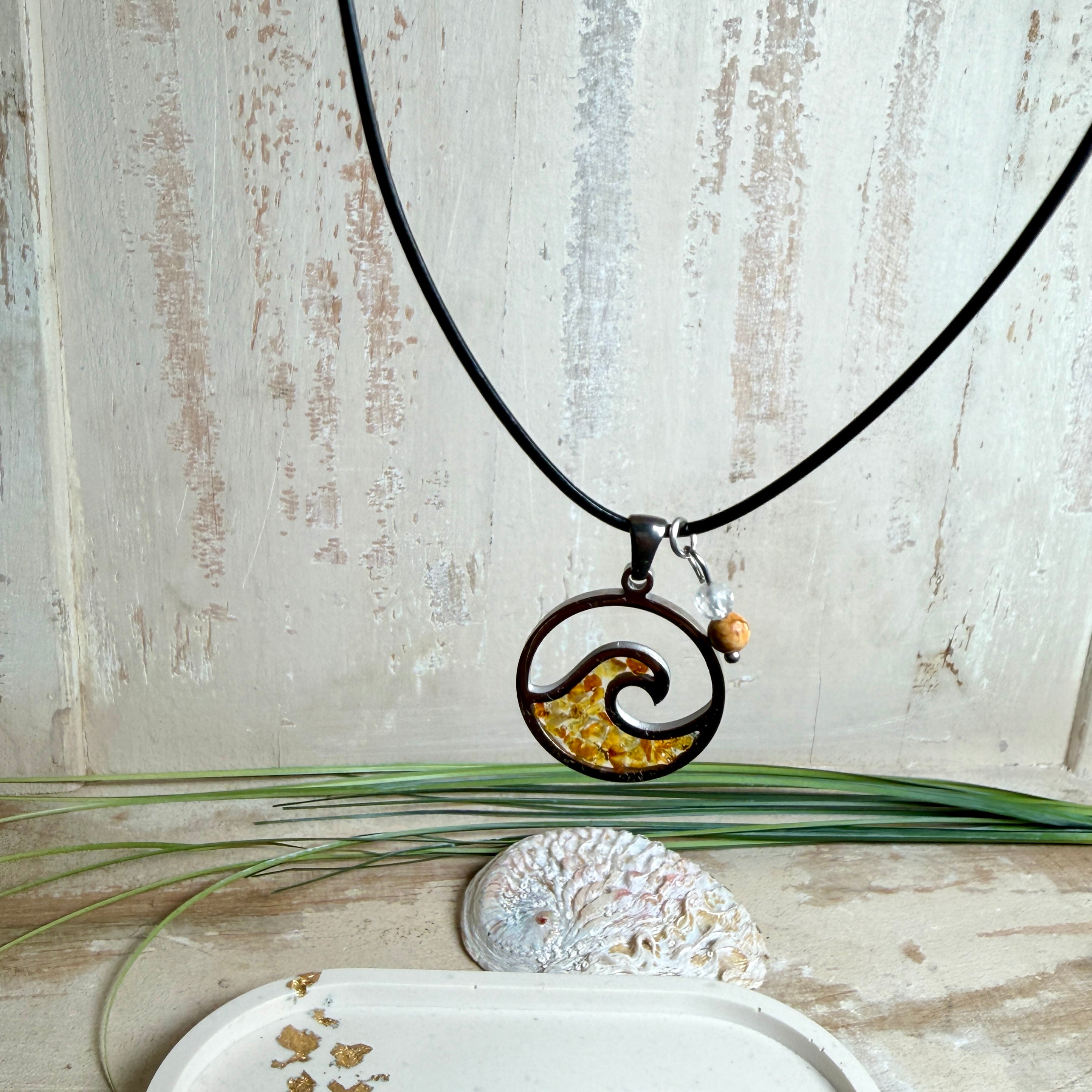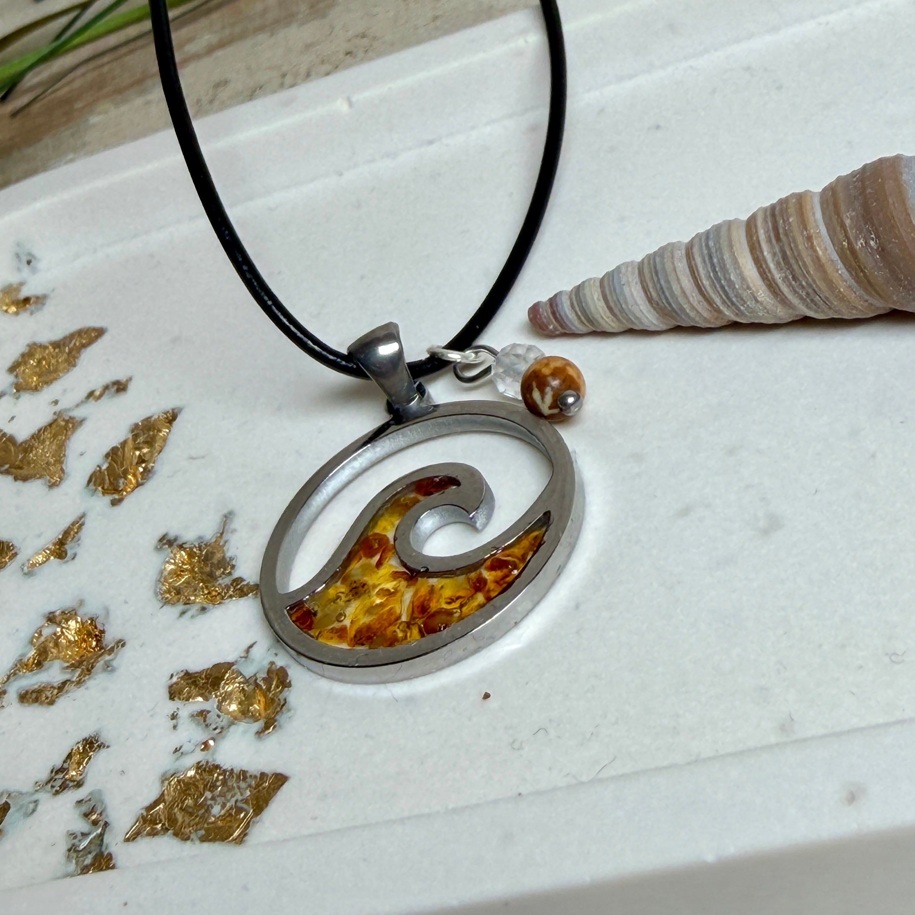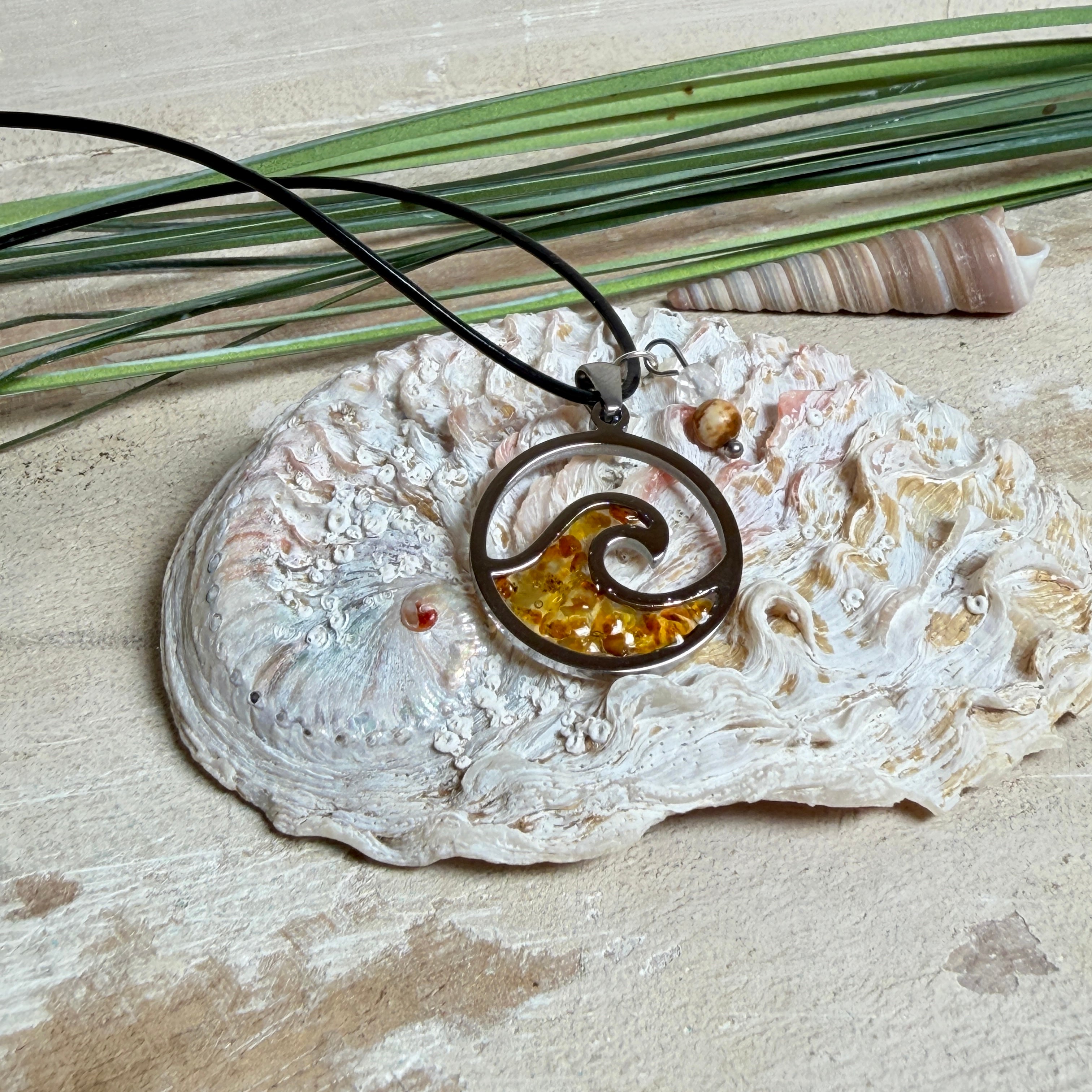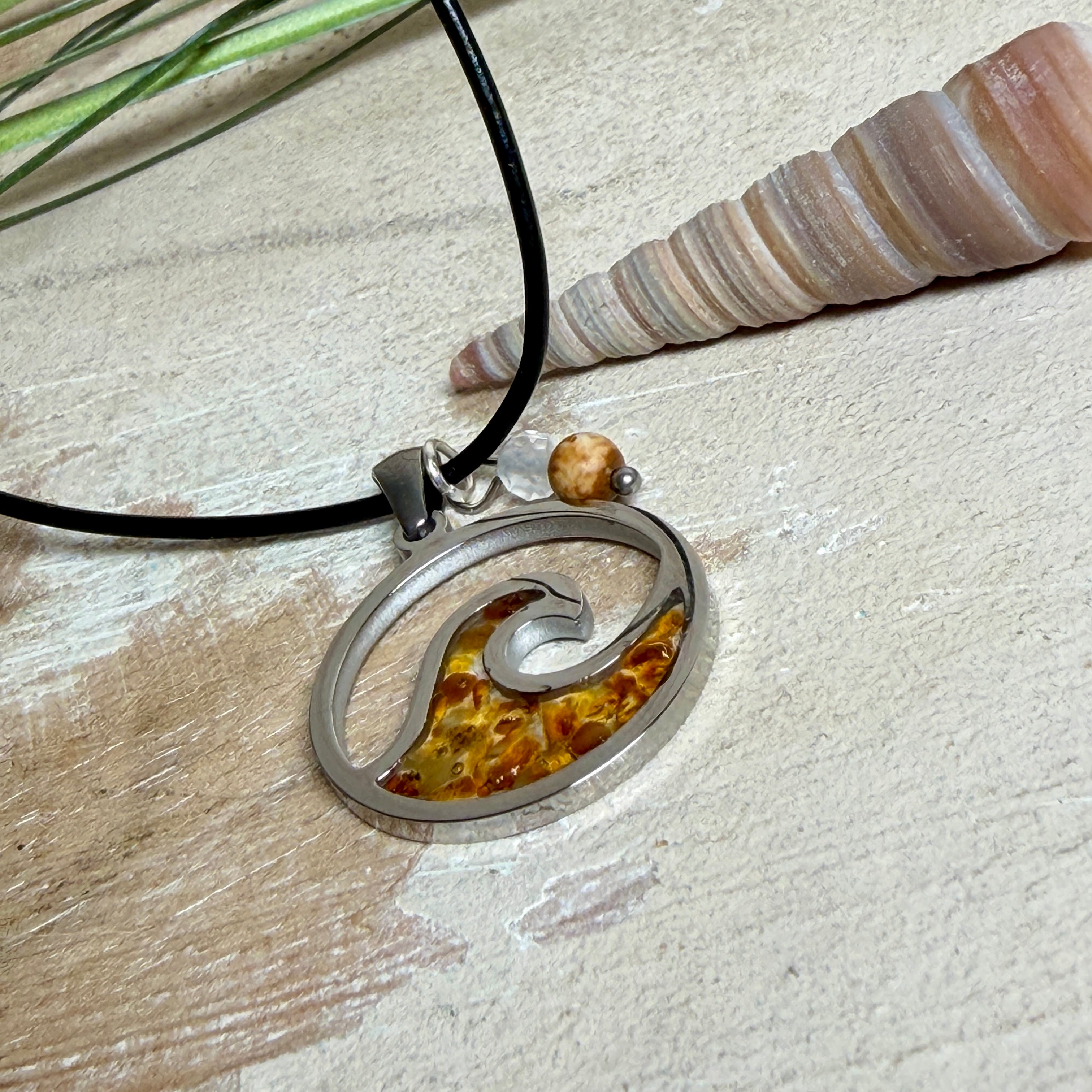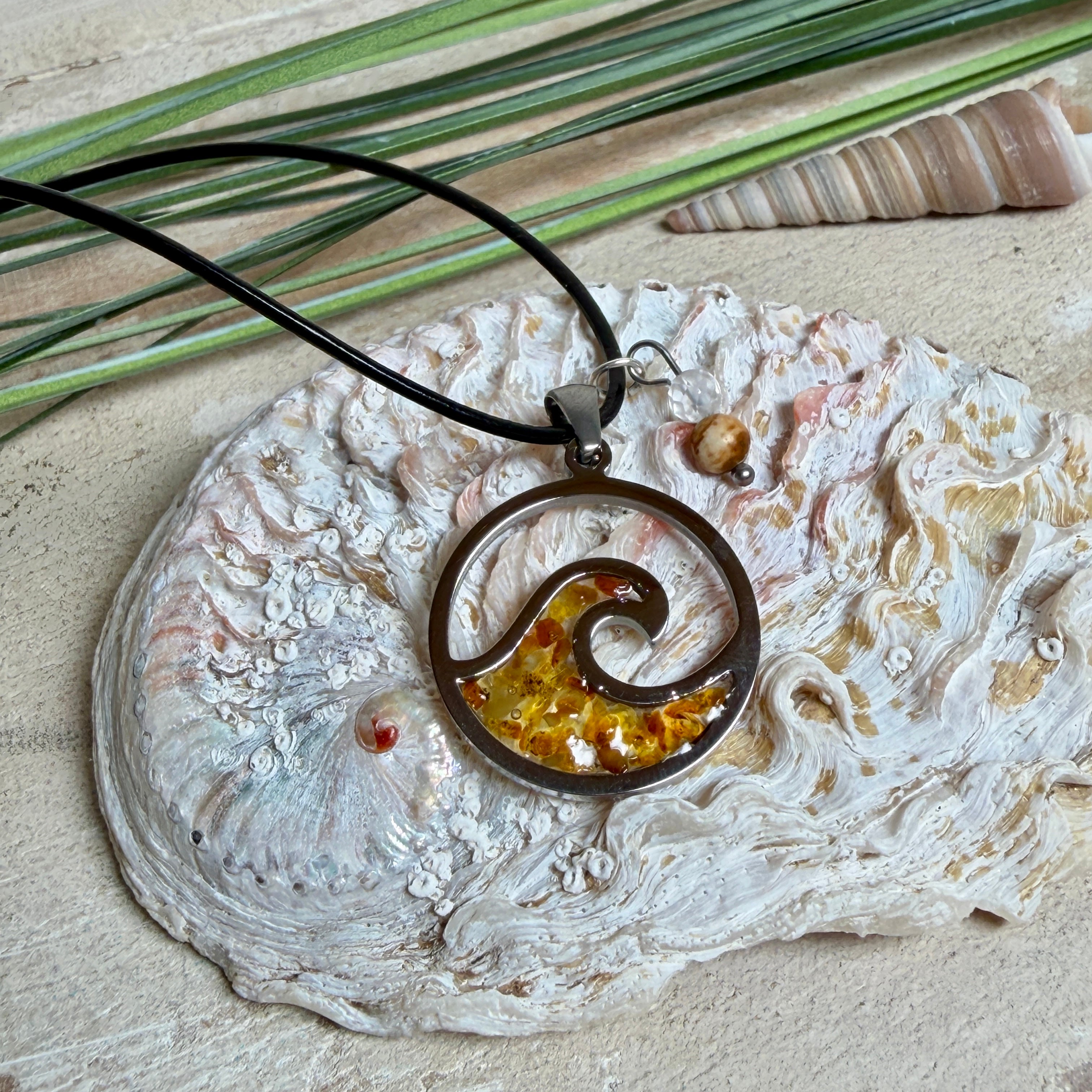 Wellenanhänger aus Edelstahl mit Bernstein und Harz