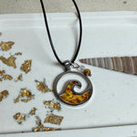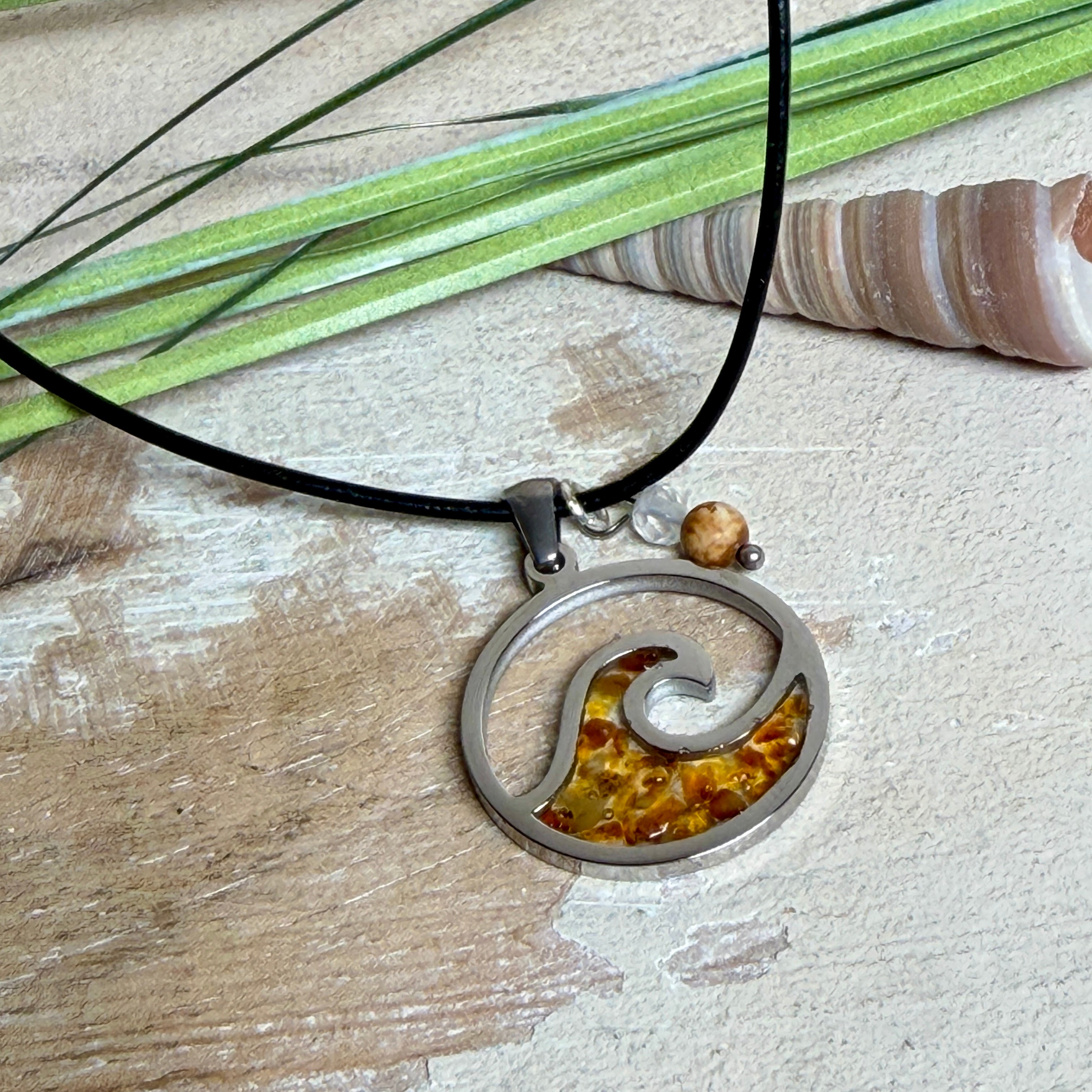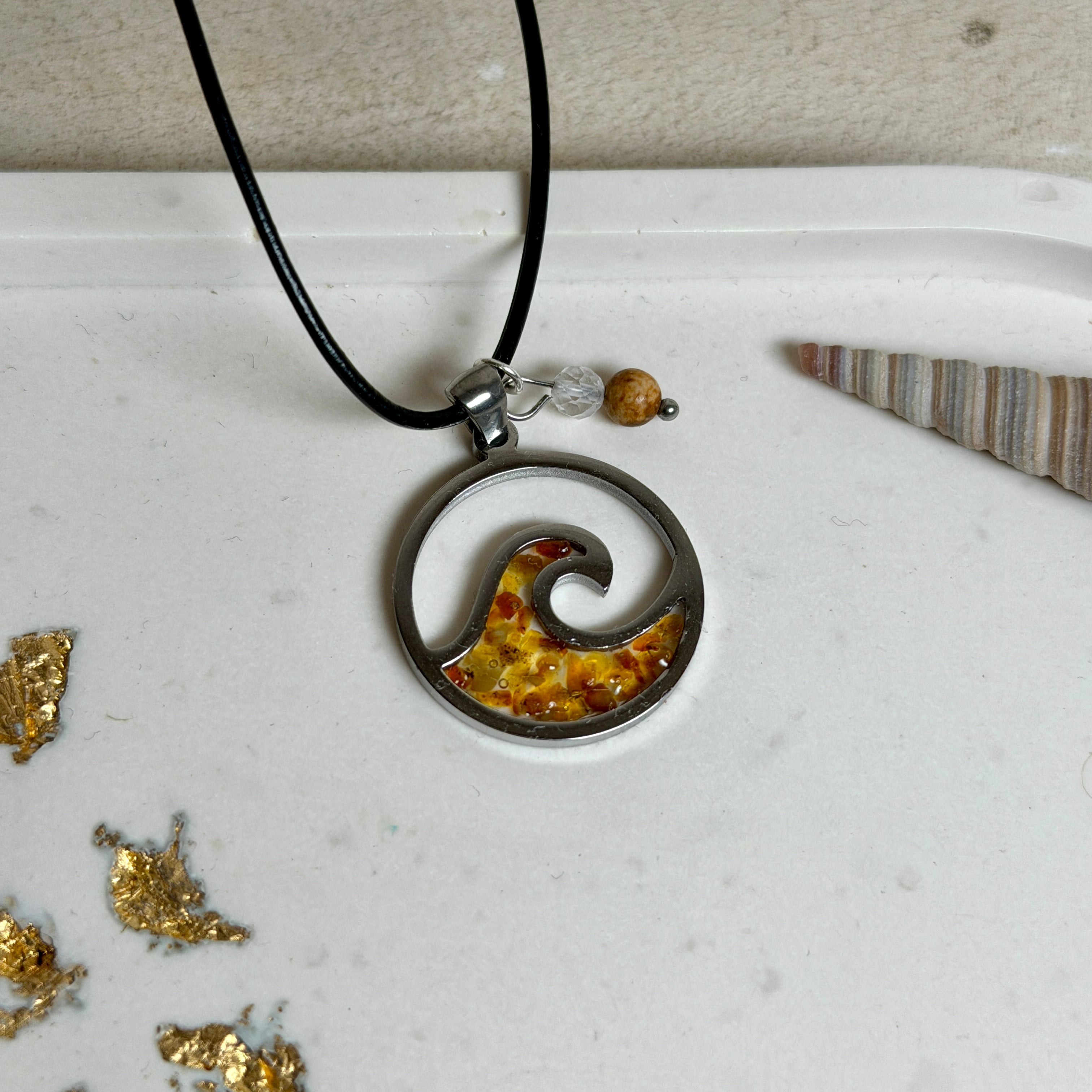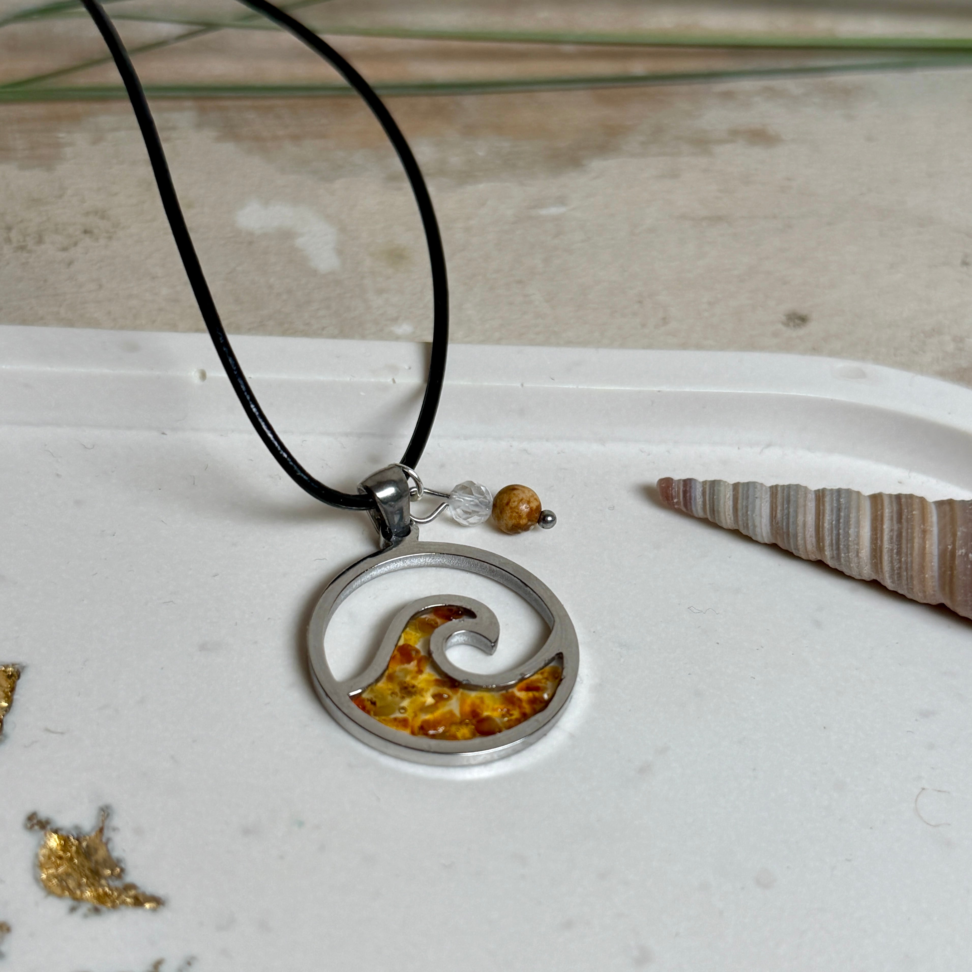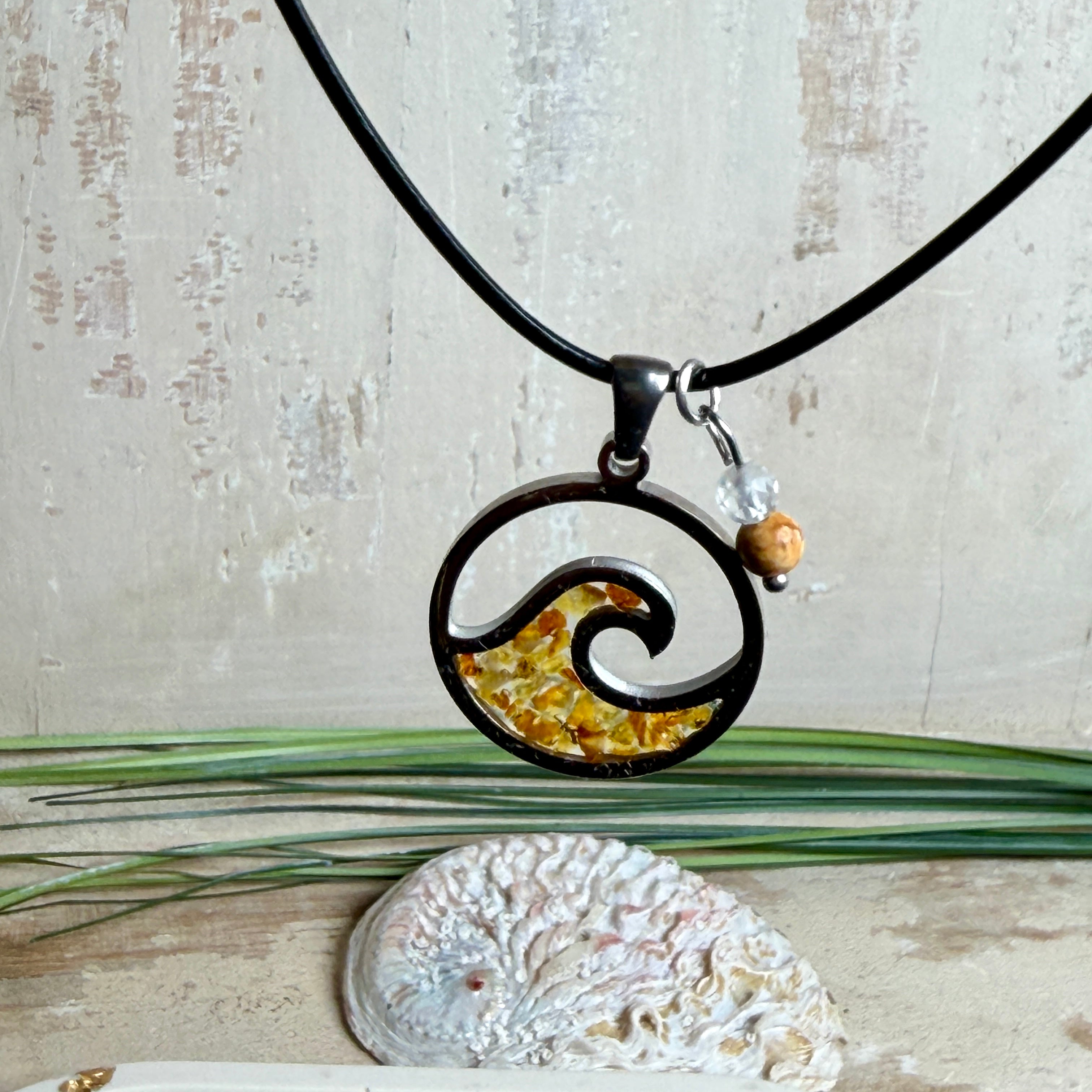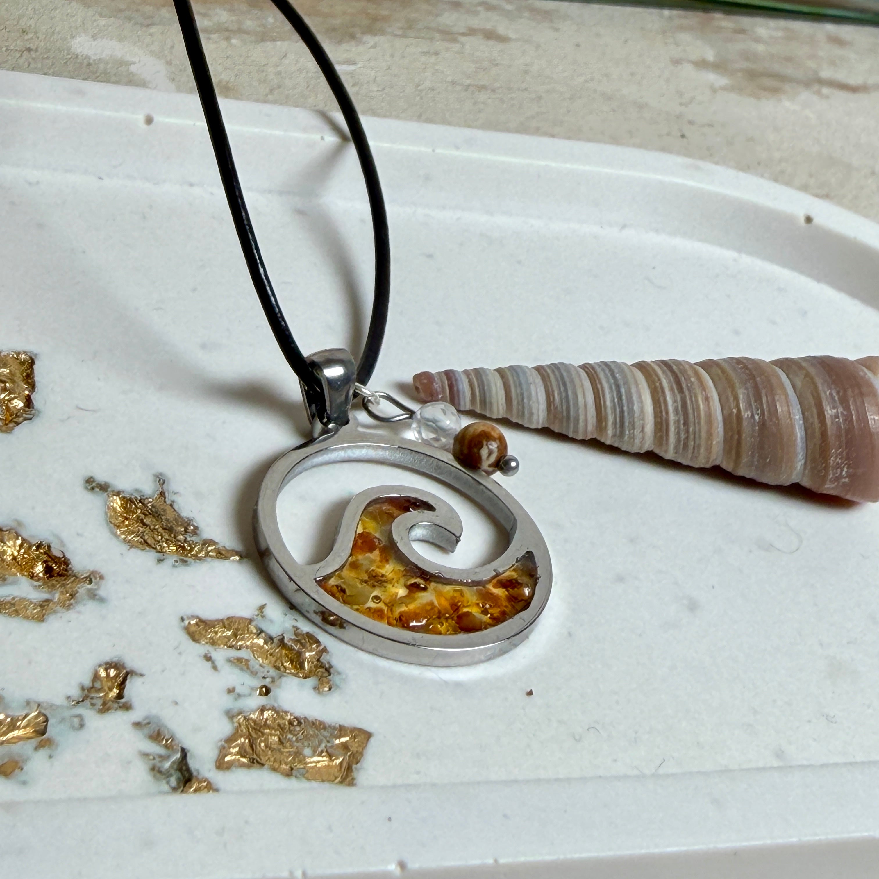 Wellenanhänger aus Edelstahl mit Bernstein und Harz